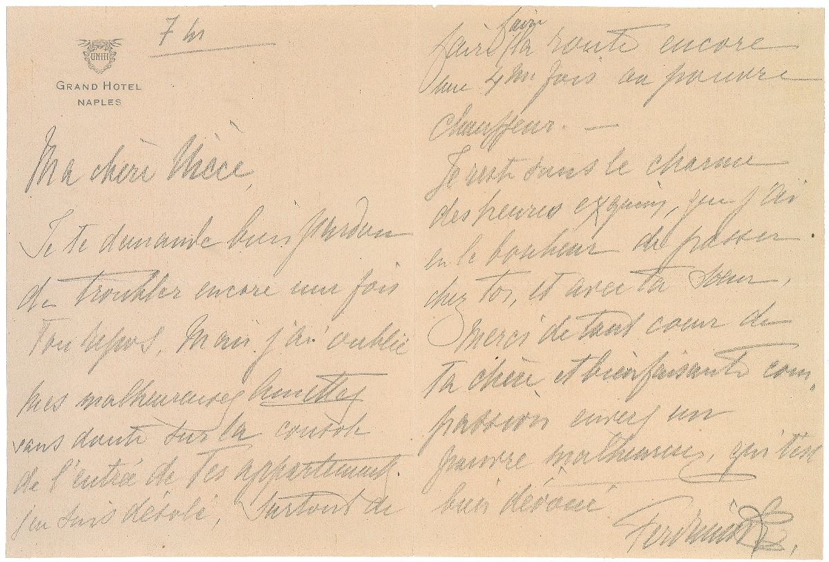 Bulgarian King (1861–1948) who ruled from 1908 until his death in 1918. Untranslated ALS in pencil in French, signed “Ferdinand,” two pages on two adjoining sheets, 5.5 x 7.5, Grand Hotel, Naples letterhead, no date. In fine condition.