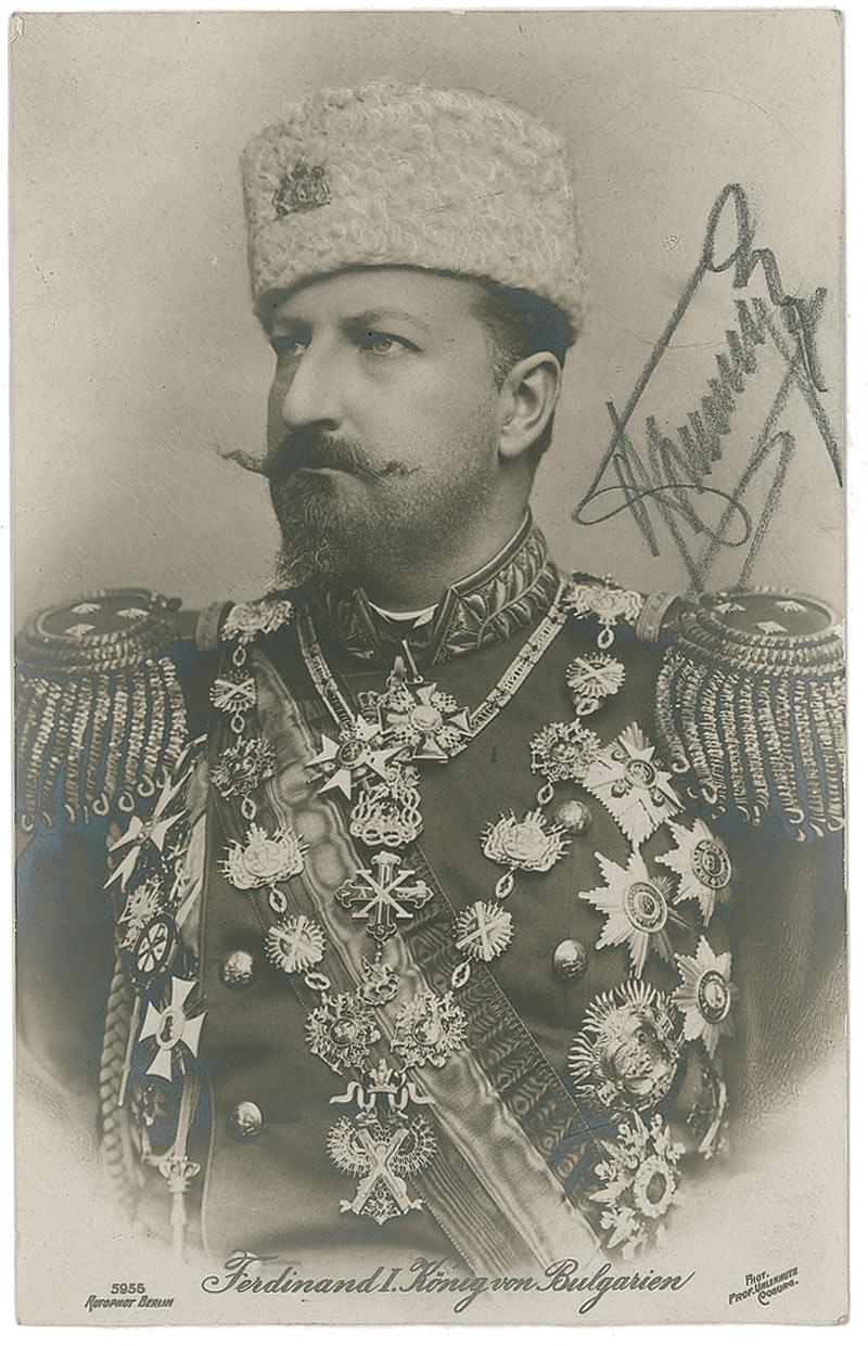 Ruler of Bulgaria from 1887 to 1918. Vintage 3.25 x 5.25 postcard photo of Ferdinand in royal dress, signed in pencil. In fine condition, with a bit of light silvering to the edge and circular impressions to top right affecting a portion of the signature.