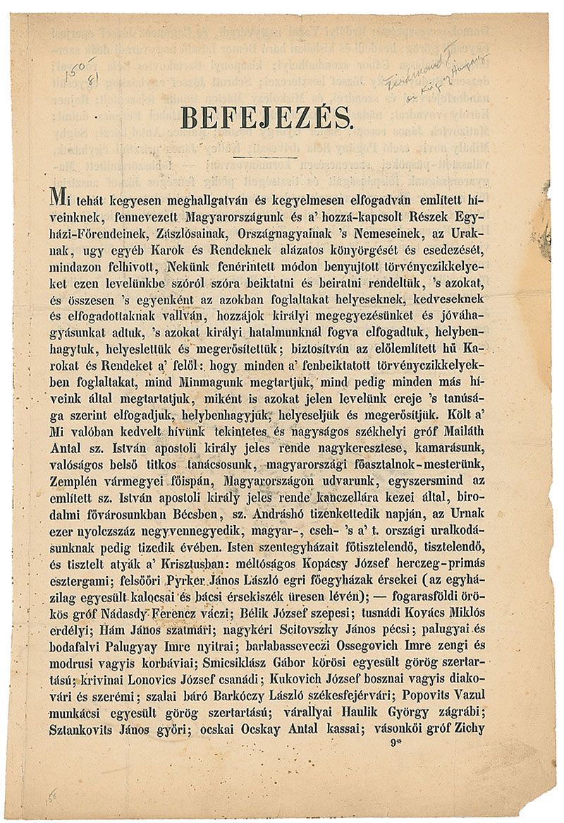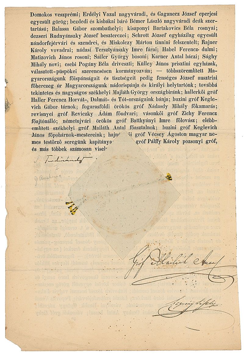 Ruler of Bulgaria from 1887 to 1918. Printed broadside in Hungarian, signed at the conclusion, “Ferdinand,” one page, both sides, 9 x 13.5, no date. The untranslated broadside is headed at the beginning, “Befejezes,” neatly signed at the conclusion by the king, and countersigned by two others. Intersecting folds, several small pencil notations, and some scattered toning, primarily from seal, otherwise fine condition. The large paper seal is crisp and intact. Accompanied by the original Paul C. Richards folder.
