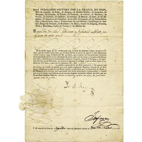 <B>King Ferdinand VII Manuscript Document Signed</B></I> “<I>Yo el Rey”</B></I> (“<I>I the King</B></I>”) in Spanish, one page, 8” x 11.75”. Palacio, July 24, 1833. King Ferdinand VII grants the Military Cross of Fidelity, Second Class, to Don José Nadal. Ferdinand VII reigned as King of Spain from 1808 until his death on September 29, 1833, just two months after he signed this document. From 1808-1814, he was imprisoned in France; Napoléon's brother, Joseph Bonaparte, reigned as José I Napoléon from June 6, 1808 to December 11, 1813. Ferdinand returned to Spain on March 22, 1814. His reign saw the loss of most of Spain's colonial empire in the Americas. Numerous light folds. Part of signature a bit light. Minor foxing. Paper seal affixed at left. Fine condition.<BR><BR><b>Shipping:</b> Flat Material, Small (<a target="_blank" href="http://www.heritageauctions.com/common/shipping.php">view shipping information</a>)