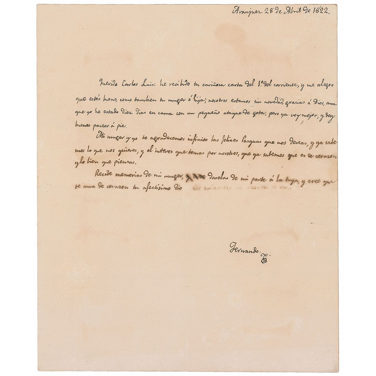 King of Spain (1784–1833) who reigned in 1808 and again from 1813 until his death. Rare ALS in Spanish, signed “Fernando,” one page, 7.5 x 9, April 28, 1822. Untranslated letter to his nephew Carlos Luis de Bourbon giving news of his health. In fine condition, with intersecting folds, a few areas of scattered light toning, and a small area of paper loss to blank second integral page.