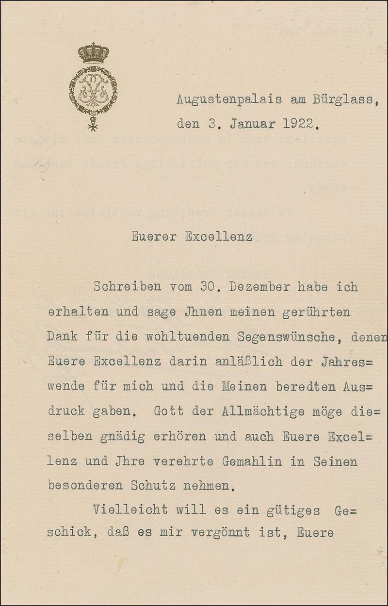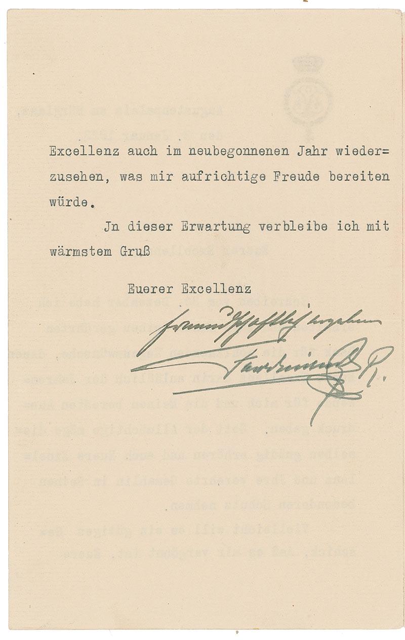 King of the Romanians from 1914 until his death in 1927. TLS in German, signed “Ferdinand R,” one page, 5.5 x 8.5, January 3, 1922. Untranslated letter, boldly signed at the conclusion by Ferdinand. In fine condition, with uniform toning, small separation along hinge, and light pencil remnants to first page.