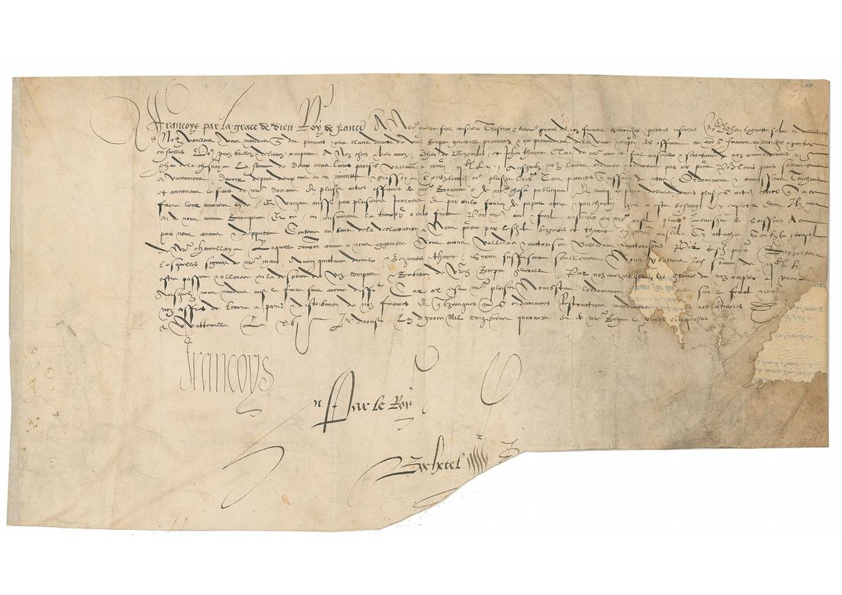 Monarch of the House of Valois who ascended to the French throne at age 15, ruling for just one year before his death (1544–1560). Rare royal vellum document signed during his extremely short reign, in French,“Francoys,” one page, 17.5 x 9.75, Rheims, September 16, 1559. The document, written to “Our friends and faithful keepers of our accounts at Paris,” states in full (translated): “The young King Francis II corrects an error in the amount of 100 pounds made in the accounting records of ‘the exploits and fines of our court of aides’ in Paris…you because the expenditure was found to exceed the receipts, have crossed out the sum of one hundred pounds Parisian written there and employed under the name of the said Dubois to whom the late King our very honored Lord and Father whom God may absolve had given it for the causes…it had been ordered to make pay and deliver to the said Dubois the said sum of c l p [100 pounds Parisian] generally of the monies coming from the said King, one year bearing the other.” In very good condition, with three vertical storage folds (one passing through a single letter of the signature), overall soiling, and a significant repaired cut to the lower right; the signature remains bold and prominent. This is just the second Francis II item we have ever offered.