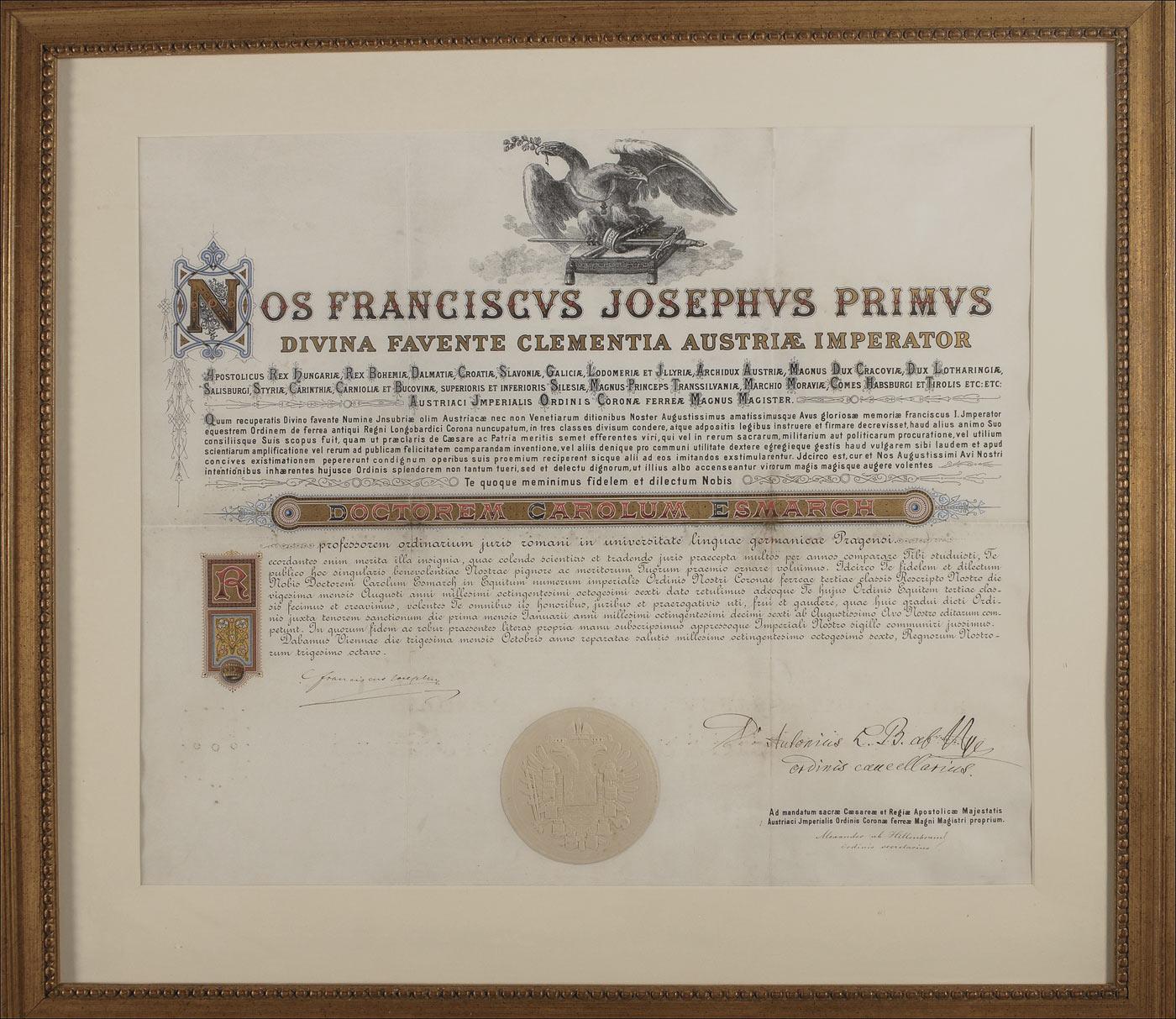 Emperor of Austria, King of Bohemia, King of Croatia and Apostolic King of Hungary from 1848 until 1916. Illuminated vellum DS signed “Franciscus Josephus,” in Latin, one page, 22.25 x 19, October 30, 1886. The Austrian emperor appoints Doctor Karl Esmarch as a full professor of Roman law at the German University in Prague. Matted and framed to an overall size of 29.5 x 26.5. In fine condition with intersecting folds (a vertical fold passing through the end of his signature) and scattered soiling. The raised seal is fully intact. Oversized.