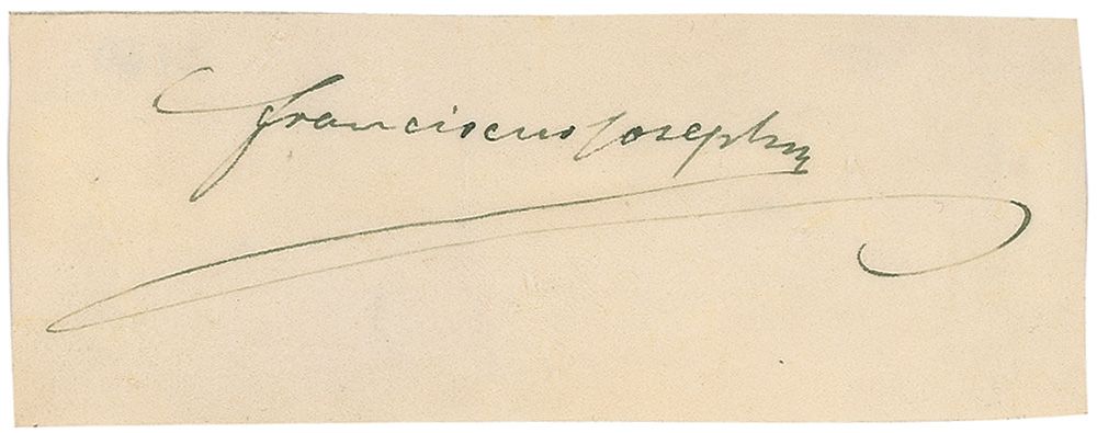 Emperor of Austria, King of Bohemia, King of Croatia and Apostolic King of Hungary from 1848 until 1916. Ink signature, “Franciscus Josephus,” on an off-white 5 x 1.75 slip, clipped from a larger document or letter. Slip has been professionally cleaned and backed. In fine condition, with a slightly fuzzy appearance to signature. Accompanied by an untranslatefd ALS from his daughter.