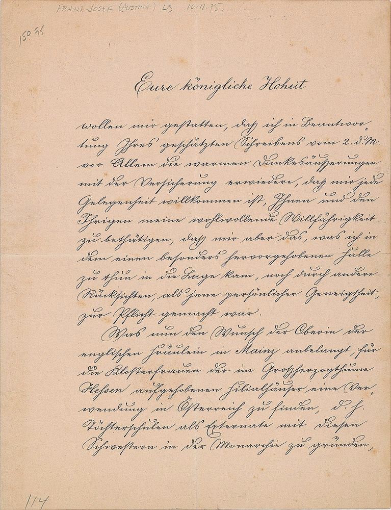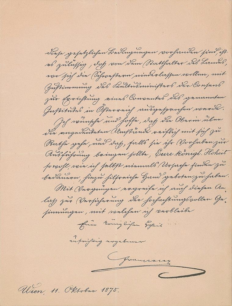 Emperor of Austria and King of Bohemia, Croatia and Hungary (born 1830) from 1848 until his death on November 21, 1916. LS in German, three pages on two adjoining sheets, 8.5 x 11.25, October 11, 1875. Letter to an unnamed "Royal Highness," in part (translated): "Regarding the desire of the Mother Superior of the Angelic Damsels in Mainz, to find a new field of activity in Austria for the nuns of the affiliated convents which have been dissolved in the Grand Duchy of Hesse, i.e., to found dayschools for girls with these nuns in the Monarchy, I am convinced that they would have a positive effect on the instruction and education of feminine youth, just as do the already existing convents; nonetheless, under the present circumstances it is to be feared that the introduction of these communities would have great difficulty in attaining the conditions for effective activity in securing their means of livelihood, which the most powerful protection would not entirely be able to remove. If the Mother Superior wishes to make the attempt in spite of this, these Angelic Damsels would first have to give proof of the necessary means of subsistence and of their legally recognized ability to teach; the school organization plan would have to be shown and the towns named where they wish to found such schools, and finally, they would have to become Austrian citizens." In fine condition.