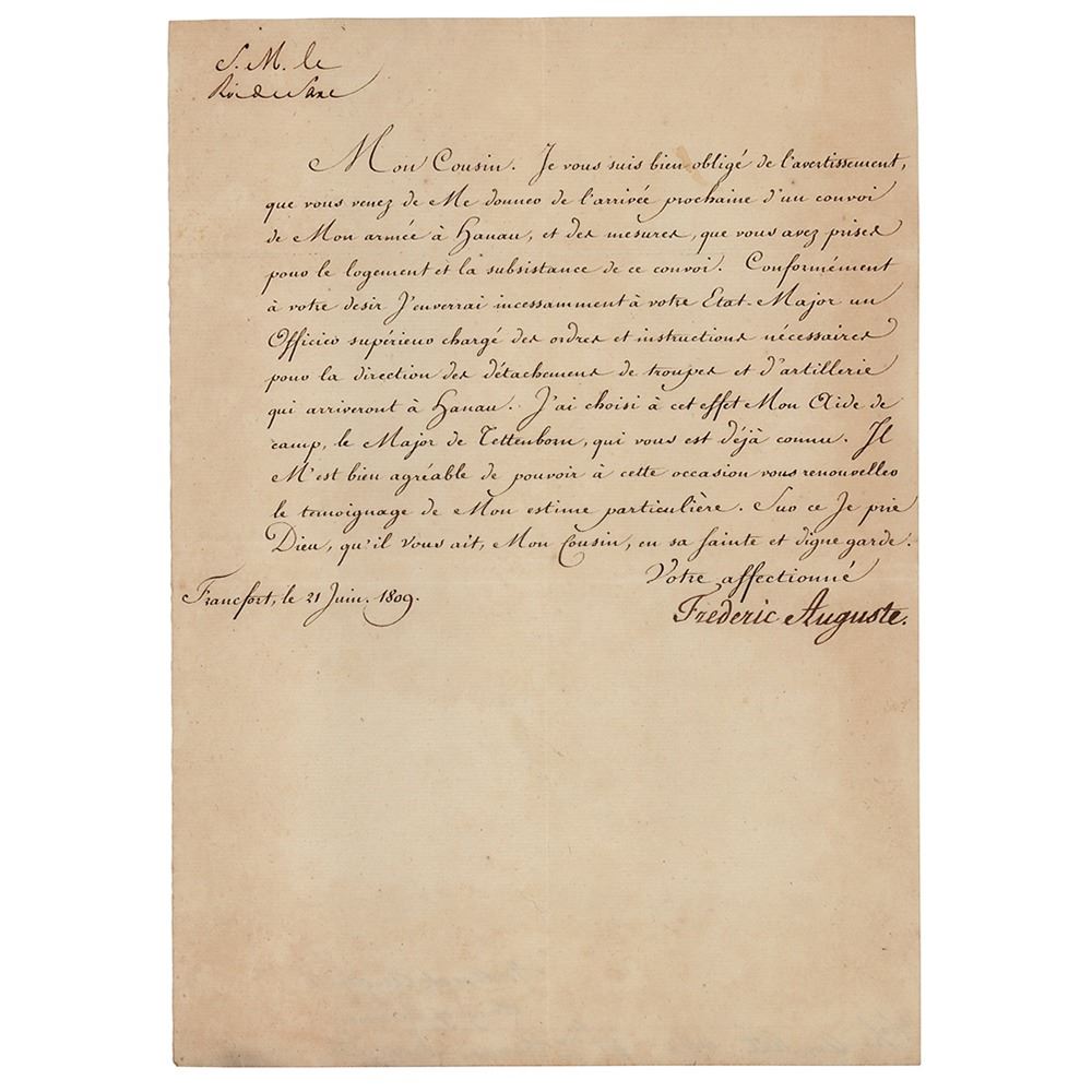 LS in French, signed “Frederic Auguste,†one page, 7.25 x 10.25, June 21, 1809. Untranslated letter on military matters. In fine condition.