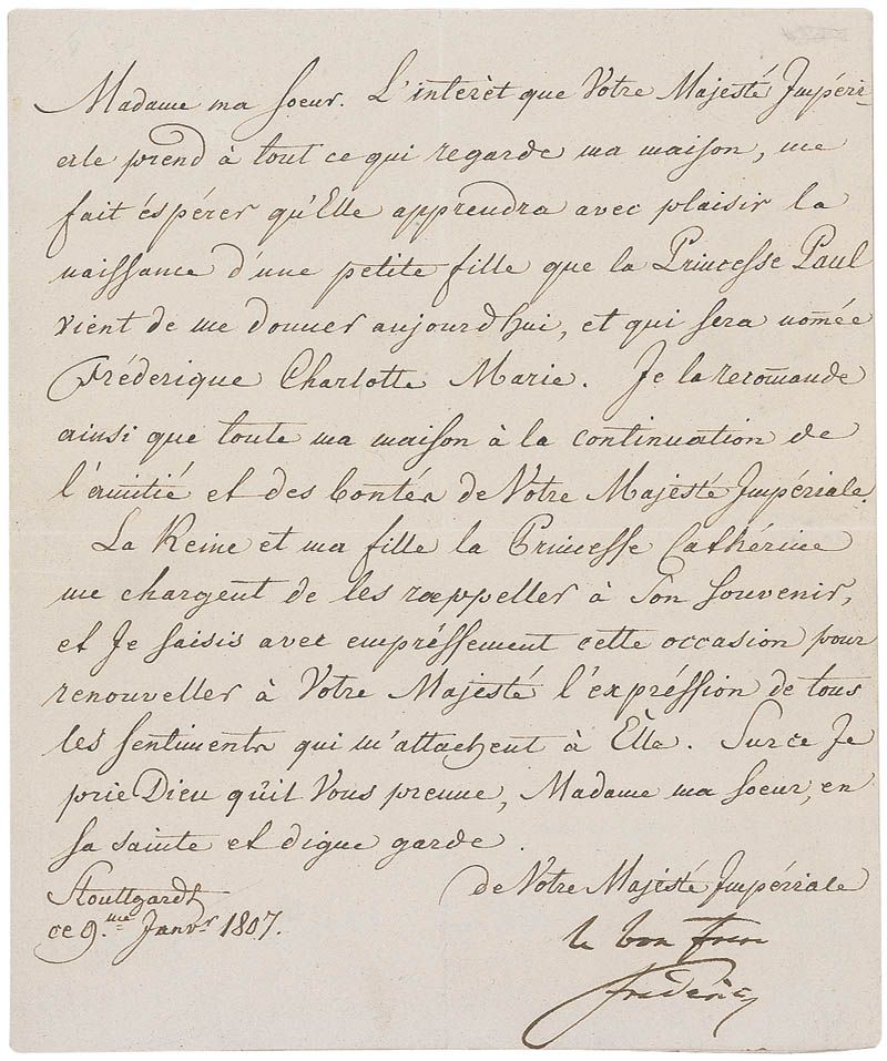 King of Saxony from 1805 to 1827. ALS in French, signed “Frederic,” one page, 7.25 x 8.75, January 9, 1807. A year into his reign, Frederick writes to “Madame, my sister.” In full (translated): “The interest your Imperial Majesty takes in my house lets me hope she will welcome the birth of a little girl that Princess Paul gave me today. Her name will be Frederique Charlotte Marie. I recommend her, along with the rest of my house, to the continuation of the friendship and kindnesses of your Imperial Majesty. The Queen [Maria Amalia] and my daughter, Princess Catherine, request me to remind them of her memory, and it is with great pleasure that I take this opportunity to express to your Majesty all the feelings I hold for her. I pray God keep you, Madame, my sister, in his holy and worthy guard. From your Imperial Majesty.” In fine condition, with central horizontal and vertical fold and a few very subtle traces of soiling.