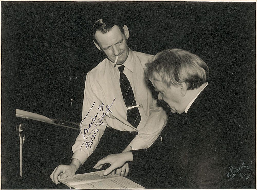 King of Denmark from April of 1947 until his death in 1972. Vintage matte-finish 9.25 x 6.75 photo of Frederick and another man looking over a manuscript, signed in purple ink, “Frederick R 18/3 1950.” In fine condition.