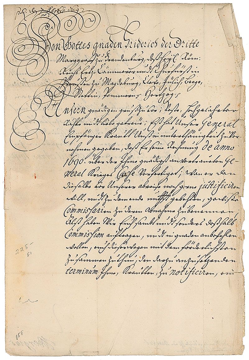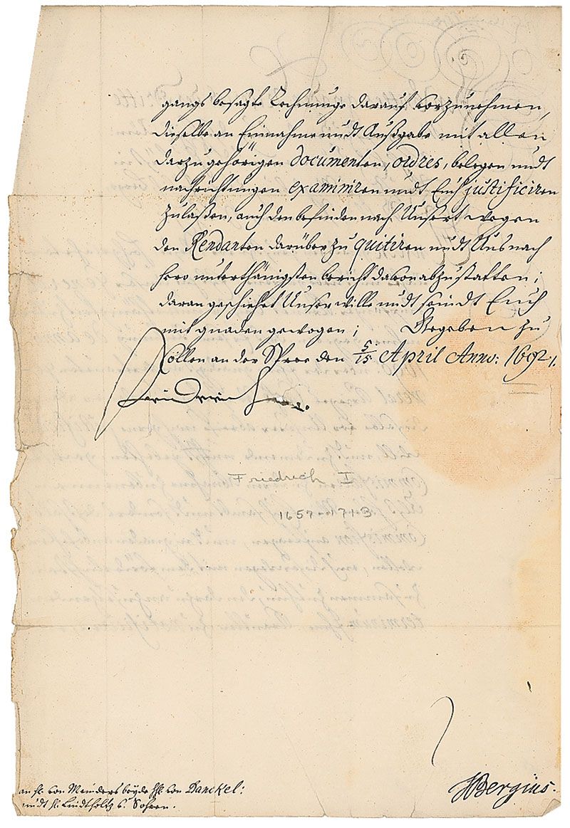 First King of Prussia (1657–1713) who ruled from 1701 until his death. LS in Old German, signed as Elector of Brandenburg, one page both sides, 8.25 x 12.25, April 15, 1692. Frederick sends his greetings to the councillors at Sohren, and states “Our General Receiver Krautt has notified us that he has set his accounts for the year 1690 for the General War Cash. The King then orders an examination and justification of all income and expenses and asks to have this certified.” Signed at the conclusion by Frederick and countersigned by Bergins. Reverse of second integral page bears an ornate address panel. In very good condition, with intersecting folds, some creasing and tears to right edges, a few small pencil notations, and circular toning from seal on second page. The ornate wax and paper seal is crisp and intact. Accompanied by the original Paul C. Richards folder.