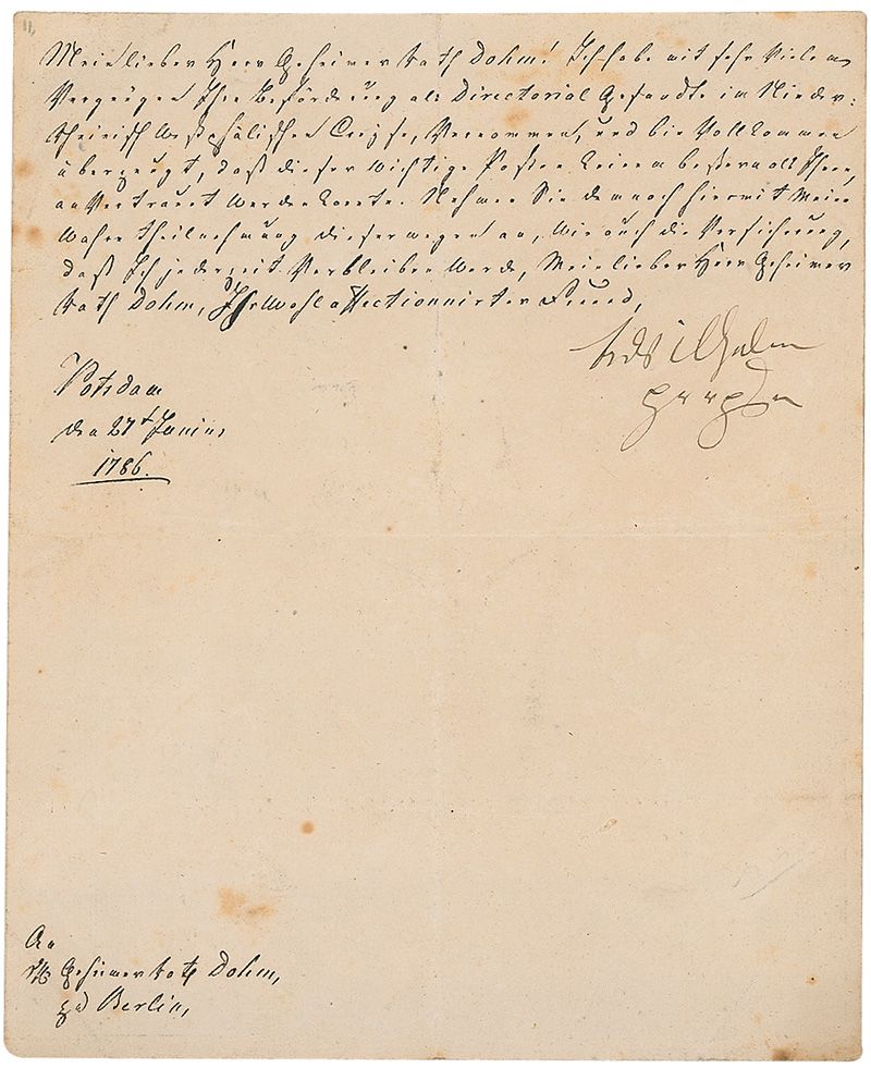 Nephew of Frederick the Great and King of Prussia from 1786-1797. LS in German, one page, 7.5 x 9.25, January 27, 1786. Untranslated letter signed at the conclusion by Frederick William shortly before ascending the throne. In very good condition, with folds, some scattered light foxing, and minor wrinkling.