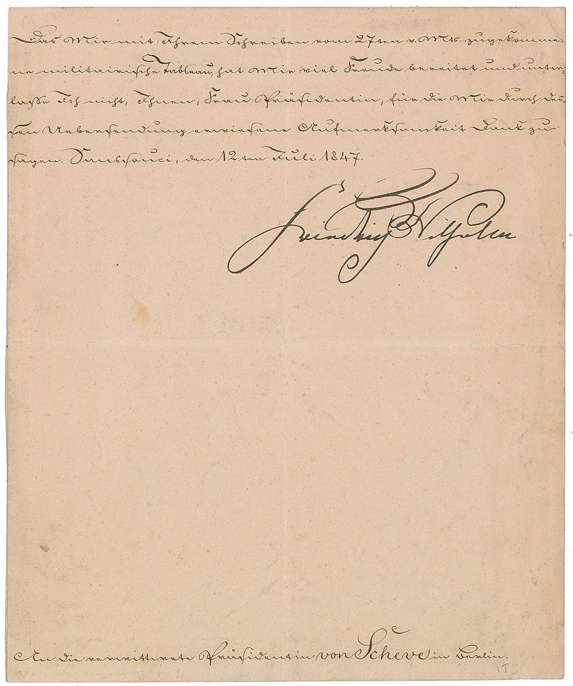King of Prussia (born 1795) who reigned from 1840 until his death in 1861. He was known as the 'romanticist on the throne,' and is best remembered for the many buildings he had constructed in Berlin and Potsdam, as well as for the completion of the Gothic Cologne Cathedral. Untranslated manuscript DS in German, one page, 8.5 x 10.25, July 12, 1847. Boldly signed at the conclusion by Frederick William. In fine condition, with scattered light soiling.