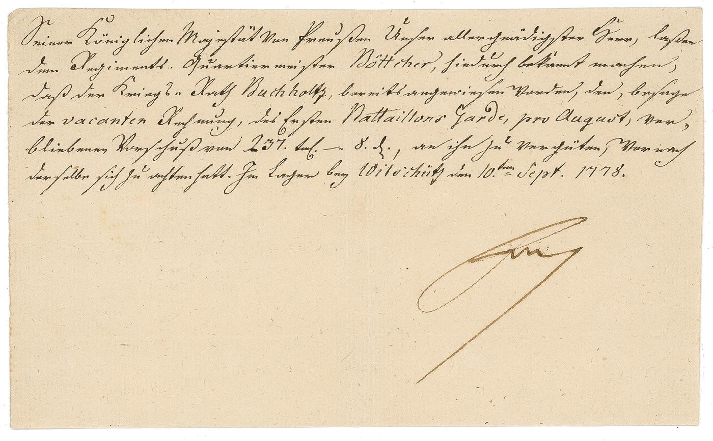 King of Prussia (born 1712) from 1740 until his death in 1786. His political prowess and enlightened attitudes toward religion, learning, and the humanities earned him the sobriquet “Frederick the Great.” LS in German, signed “Frch,” one page, 7.5 x 4.5, September 10, 1778. Letter to the Regimentsquartiermeister Böttcher with the Order, (translated): “daß der Kriegs-Rath Buchholtz, was instructed to balance the open invoice of the First Battalions Garde, for August, advance of the remaining balance of 237 Thaler; I will personally take care of it.” In fine condition, with a central vertical fold, and a uniform shade of mild toning.