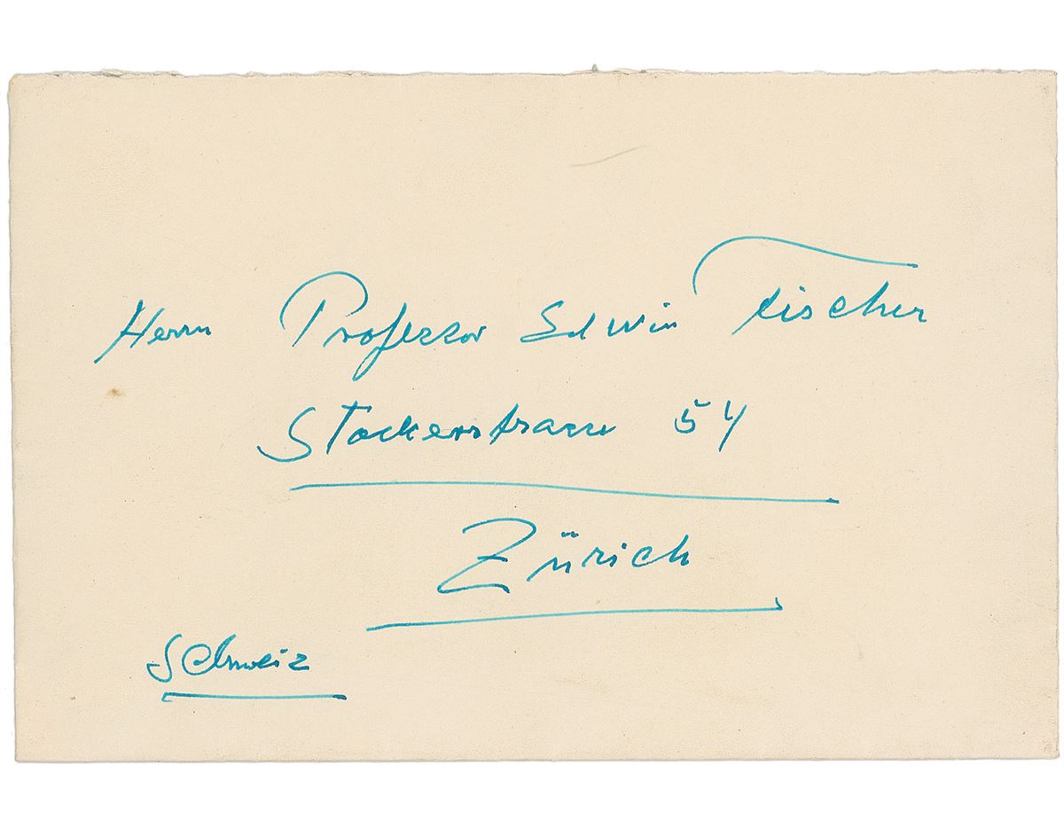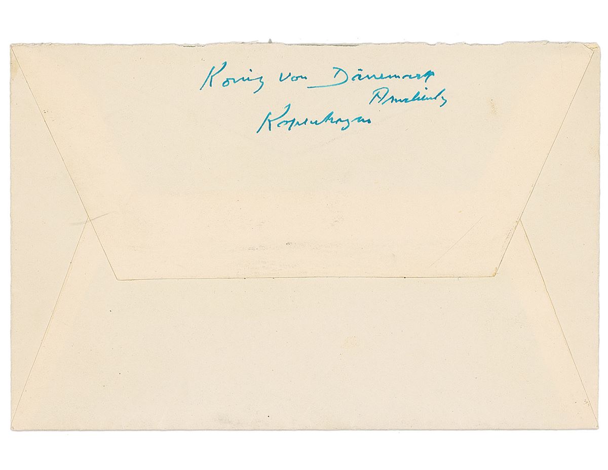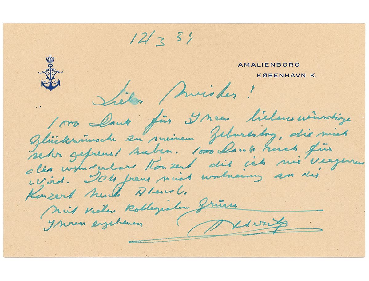 King of Denmark (born 1899) who reigned from 1947 until his death in 1972. ALS in German, signed “Frederik,” one page, 6.75 x 4.25, Amalienborg stationery card, March 12, 1954. Letter to the pianist Edwin Fische, in full (translated): “1000 thanks for your gracious congratulations for my birthday, which have me very happy. 1000 thanks for the wonderful concert I will never forget. I'm really looking forward to [it].” In fine condition. In addition to being a talented pianist, King Frederik also proved himself an accomplished conductor, having several times led the Royal Danish Orchestra. Accompanied by the original mailing envelope, addressed in his own hand.