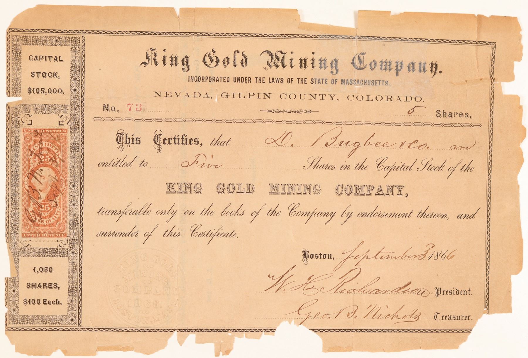 Stock Certificate from the King GMC, incorporated in 1866, incorporated in Mass, certificate number 73, issued in 9/3/1866, at Nevada, Gilpin County, Colorado, issued to D. Bugbee & Co, signed by W. H. Richardson , and Geo. B. Nichols, size 9 by 6 inches, in Average condition, issued. torn/tattered around edges, 25 cent revenue stamp, black border, raised revenue stamp. According to Hollister, this company owned No. 5, half of No. 6 west (two shafts, 130 ft. deep), and No. 3 east on the Nottoway Lode. They also have 200 feet on the Dorchester (50 ft. shaft); 300 ft. on the Golden Wedge (30 ft. shaft); and a 12-stamp mill in the gulch. W.A. Abbee is agent. Calls the Nottoway "one of the best veins in the country" [pg. 179]. City: Gilpin Co. State: Colorado Date: 9/3/1866