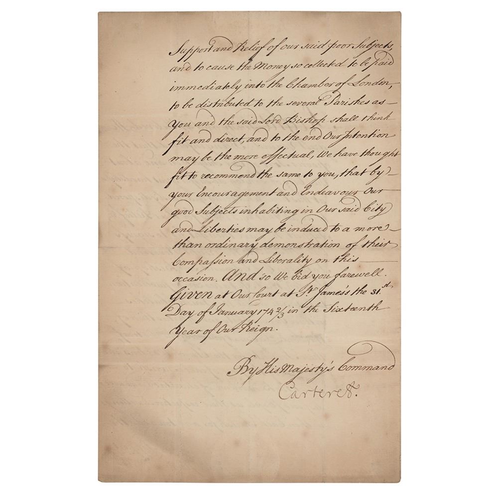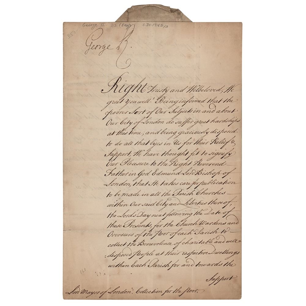 Manuscript DS, signed “George R,†one page both sides, 7.5 x 11.75, January 31, 1742. King George II orders Lord Mayor of London Robert Willimott to undertake a collection for the poor. In part: "Being informed that the poorer sort of our subjects in and about our City of London do suffer great hardships…and being graciously disposed to do all that lyes in us for their release and support, we have thought fit to signify our pleasure to the…Lord Bishop of London that he takes care for publication to be made in all the Parish Churches…the Lord's Day next following the date of the presents for the Church Wardens and overseers of the poor of each parish to collect the benevolence of charitable and well-disposed people at their respected dwellings…for and towards support and relief of our…poor subjects and to cause the money so collected…to be distributed to the several parishes as you…and the Lord Bishop shall think fit." Prominently signed at the head by King George II and countersigned at the conclusion by his principal advisor John Carteret, 2nd Earl Granville. In very good to fine condition, with intersecting folds, light soiling, and edge toning.