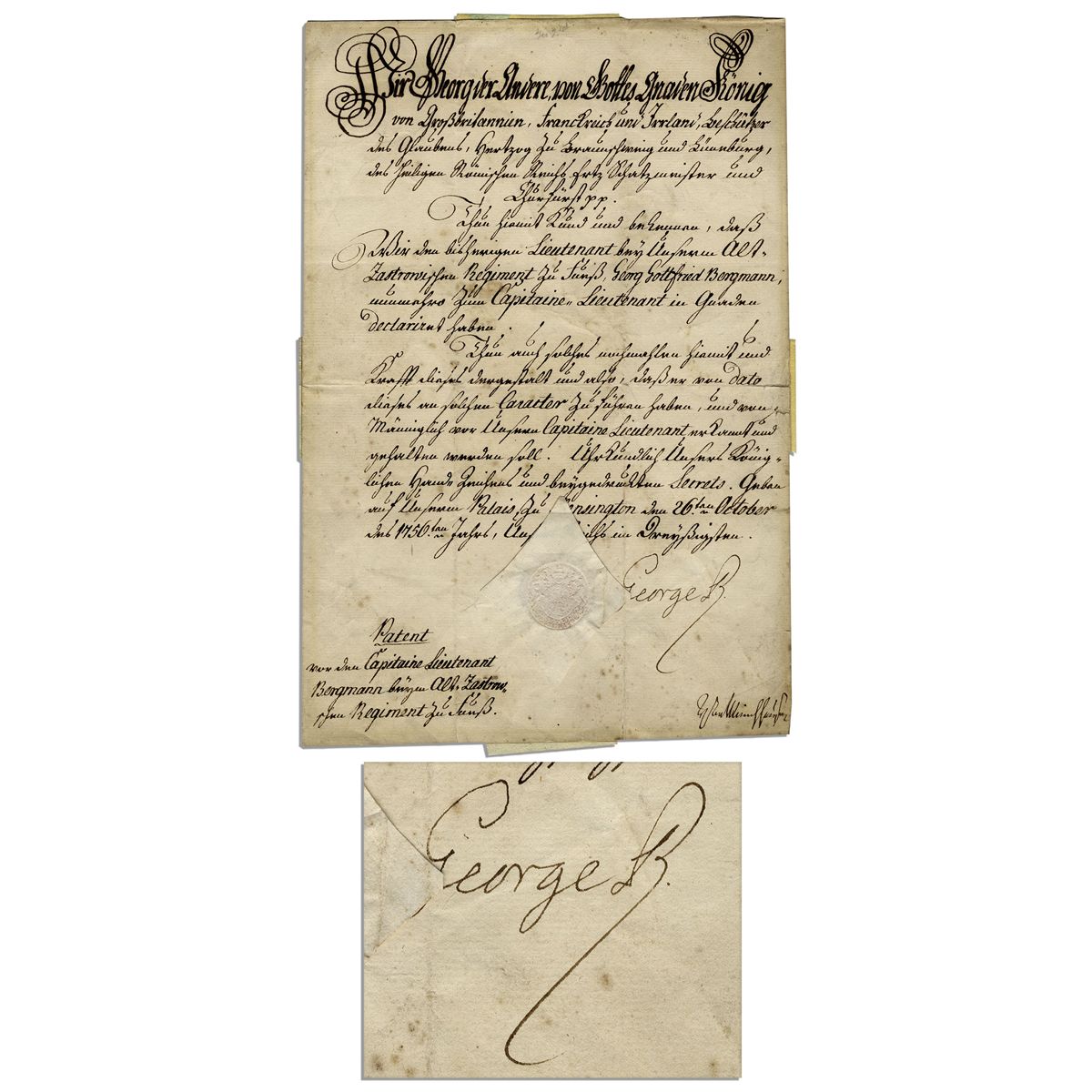 King George II document signed ''George R''. Handwritten document is a military appointment dated 26 October 1756, at the start of the Seven Years' War. Serves to promote one George Gottfried Bergman to the position of Captain Lieutenant in the Old Zastrow Foot Regiment. A wax and paper seal is affixed at the conclusion to the left of the signature. Document measures approximately 8.5'' x 12.5'', matted and framed with a portrait of George to an overall size of 21'' x 17''. It has not been removed from the frame for inspection but save for creasing appears near fine, especially given age.
