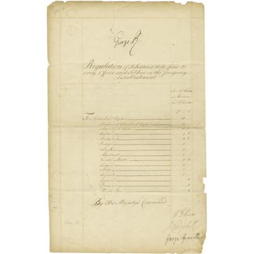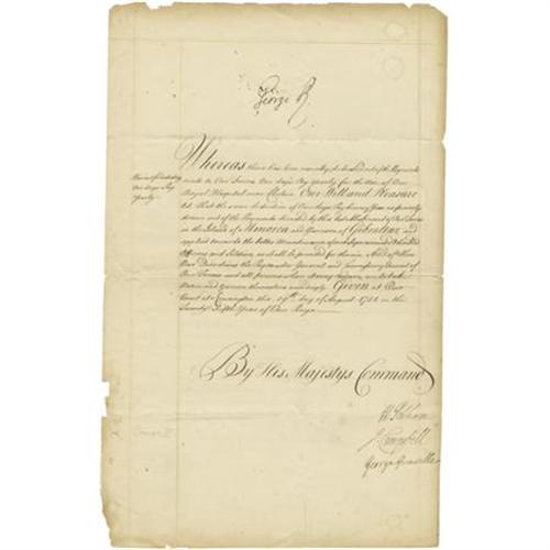 <B>King George II of Great Britain Manuscript Document Signed Twice</B></I> "<I>George R</B></I>". Two pages (one leaf), 11.5" x 18.5", Kensington Court, August 19, 1751, a "<I>Warrant for deducting one days Pay Yearly</B></I>" Also signed on both pages by "<I>H</B></I>[enry] <I>Pelham</B></I>" as Prime Minister, "<I>J Campbell</B></I>", and "<I>George Grenville</B></I>" as Lord of the Treasury. King George II (1683-1760) was the last British monarch to have been born outside Great Britain. He is famous for numerous conflicts with both his father, King George I, and his son, King George III. Early on, he was a weak ruler, allowing Sir Robert Walpole to essentially control the government. Folds, with minor separations thereat, rough edges, else about very good. A fine assemblage of signatures.<BR><BR><BR><b>Shipping:</b> Flat Material, Small (<a target="_blank" href="http://www.heritageauctions.com/common/shipping.php">view shipping information</a>)