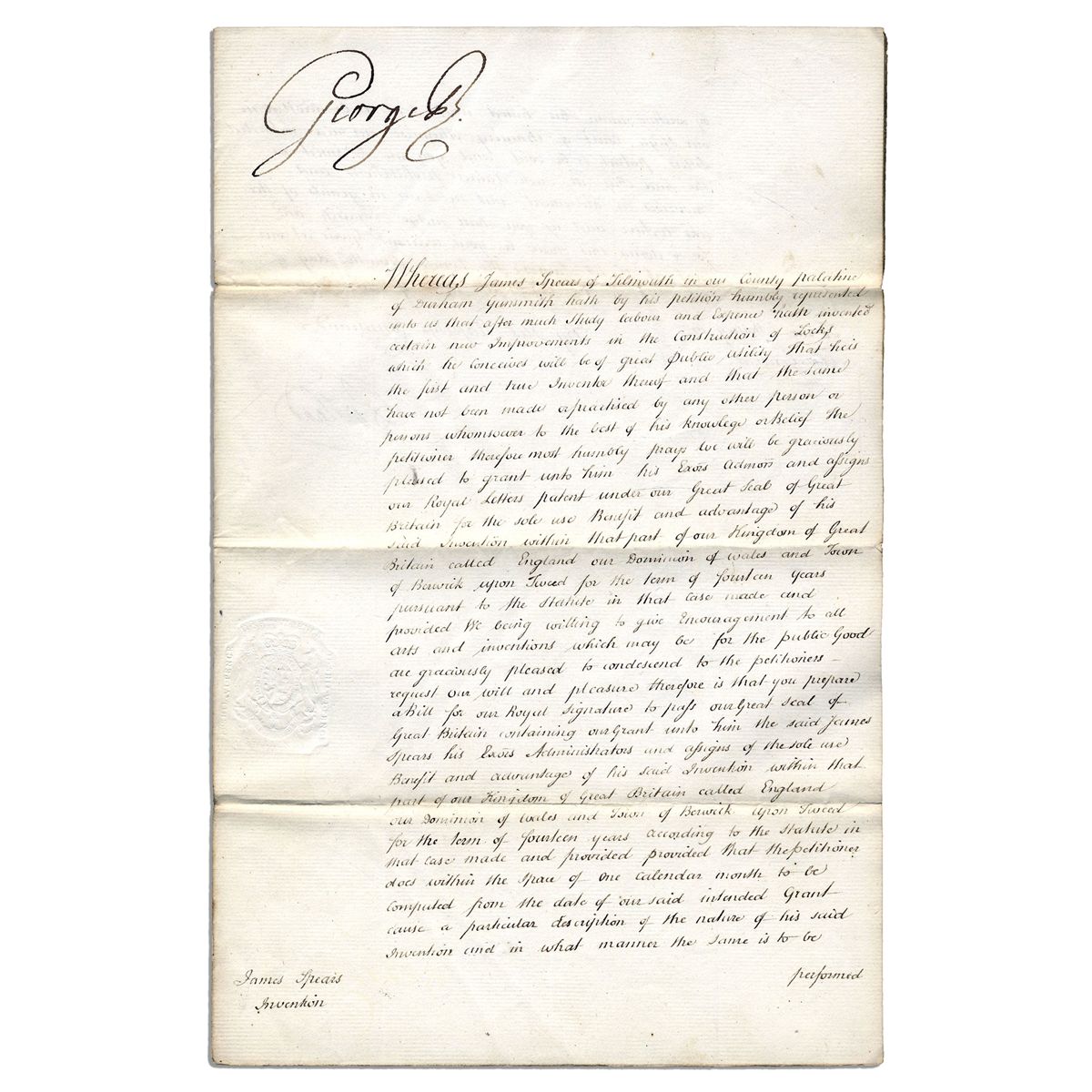 King George III patent document signed ''George R'' in large script at the top edge. Georgian patent issued 27 July 1795 is for Durham gunsmith James Spears' improvement to the construction of locks. 2pp. on card-style stationery, countersigned by Portland. Measures 8'' x 12.25''. Inventor's name is noted on verso panel. Toning, else near fine.