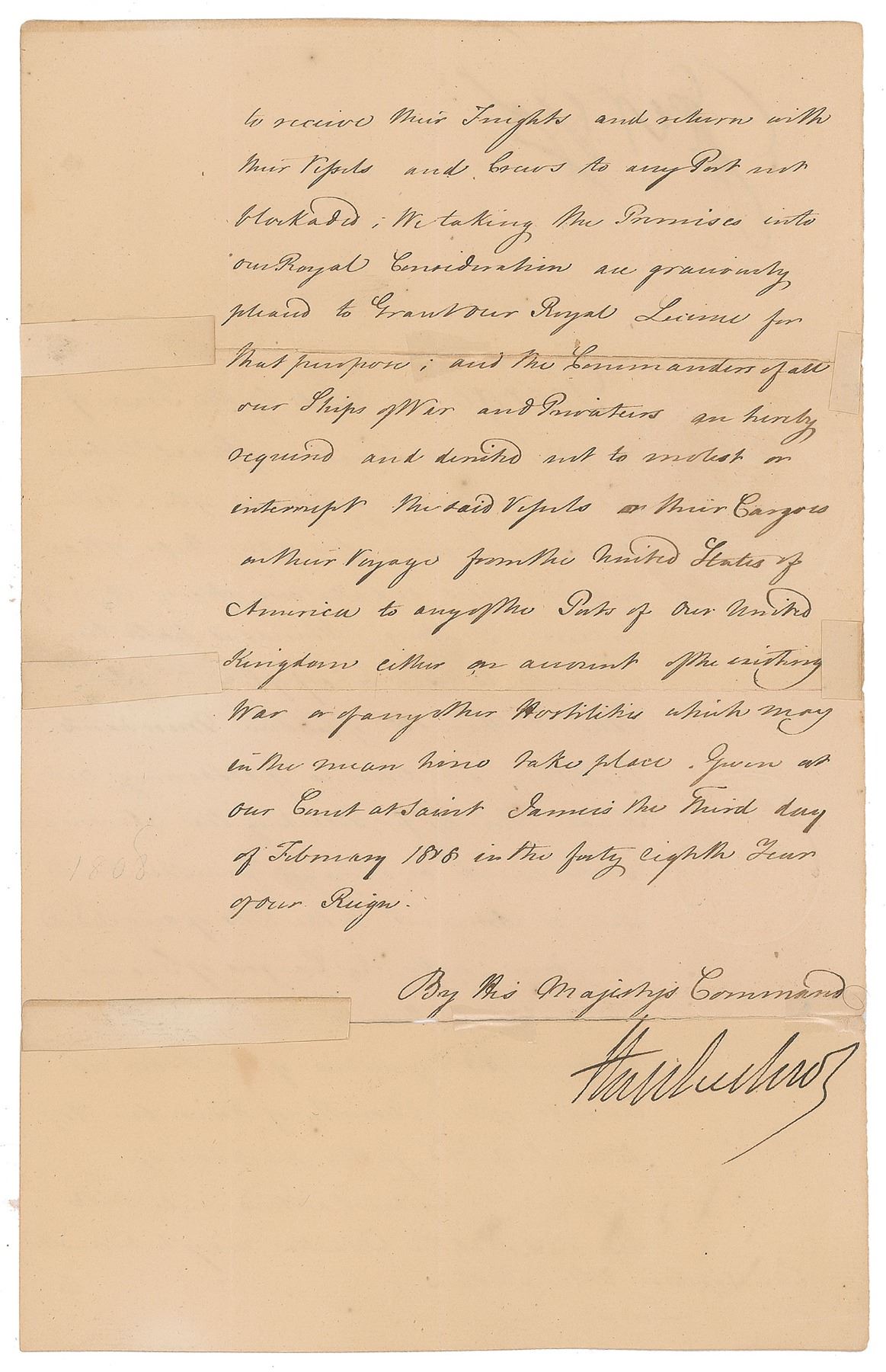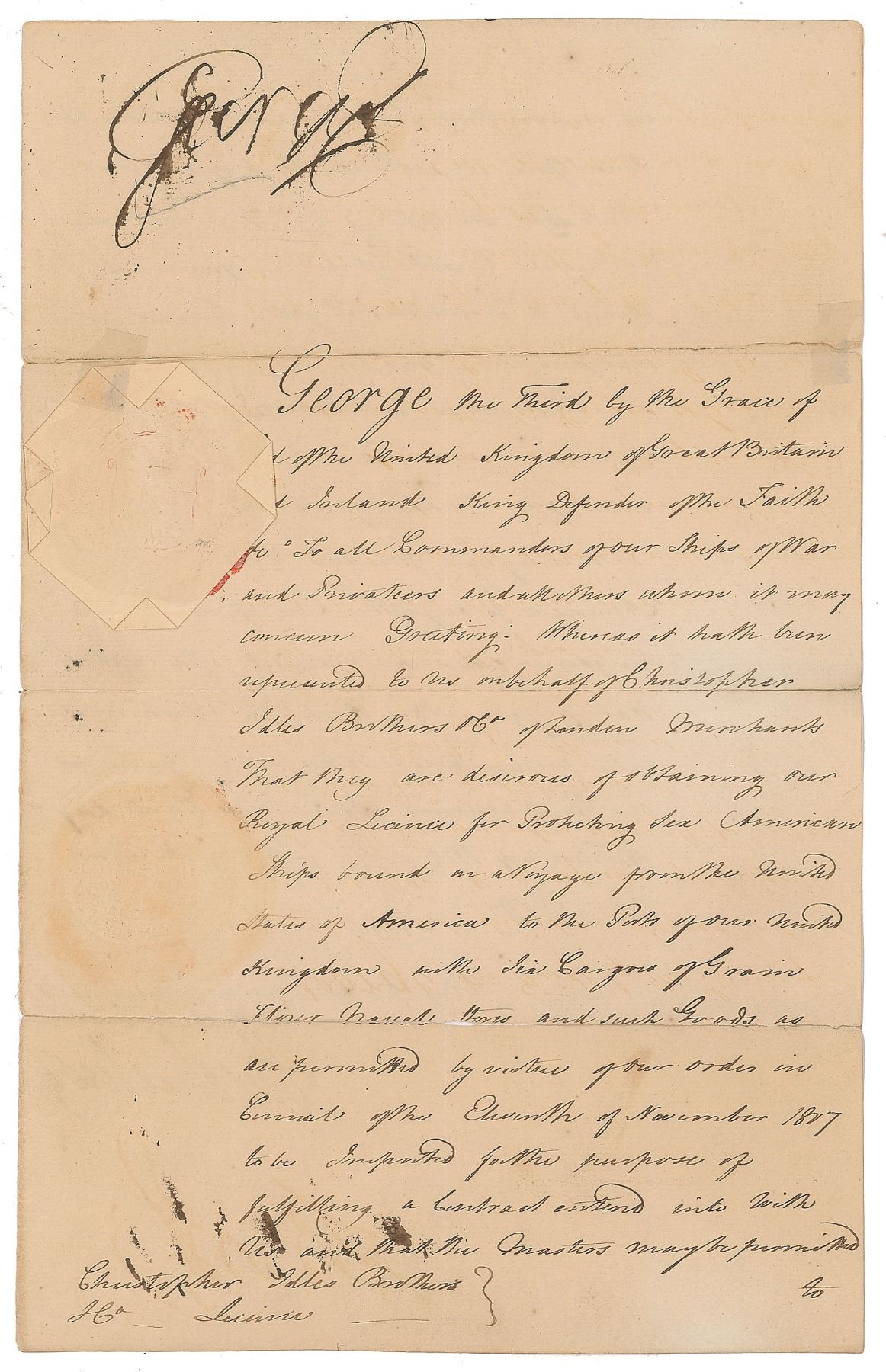 Manuscript DS, signed “George R,” one page both sides, 7.75 x 12.5, February 3, 1808. Amidst the Napoleonic Wars, King George III issues a Royal License to a London merchant to safely carry their goods on six American ships. In part: "To all Commanders of our ships of War and Privateers and all others…Christopher Idles Brothers & Co., of London Merchants…are desirous of obtaining our Royal License for Protecting Six American Ships bound on a voyage from the United State of America to the Ports of our United Kingdom with Ten Cargoes of grain, Flower, Naval Stores and such…and that the masters may be permitted to receive their freight and return with their vessels and crews to any Port not blockaded…[We] are pleased to Grant our Royal License for that purpose; and the Commanders of all our Ships of War and privateers are hereby required and directed not to molest or interrupt the said vessels or their cargoes on their voyage from the United State of America to any of the Ports of our United Kingdom either on account of the exiting War or of any other Hostilities which may in the meantime take place." Signed at the head by King George III, and countersigned at the conclusion by Baron Hawkesbury (later Prime Minister Lord Liverpool). In very good condition, with repairs to complete splits along the folds.