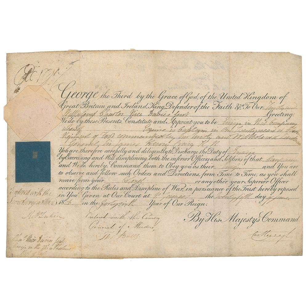 Partly-printed vellum DS, signed “George R,” one page, 13.25 x 9.25, June 25, 1806. King George III appoints Charles Rice Davis as ensign in a "Regiment of Foot commanded by our trusty and welbeloved Lieutenant General Sir James Henry Craig K. R." Signed at the head by King George III and countersigned at the foot by Viscount Castlereagh. The white paper seal affixed to the left side remains intact. In fine condition, with skipping to the signature.