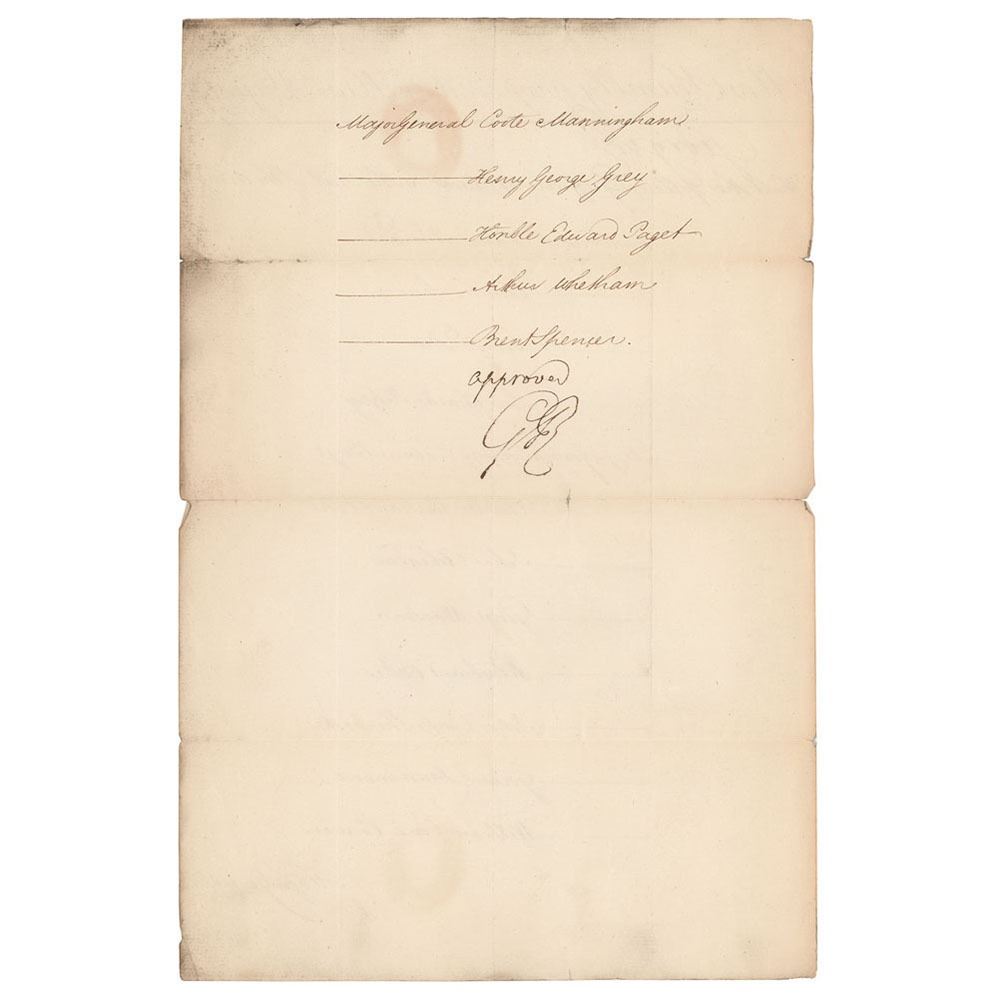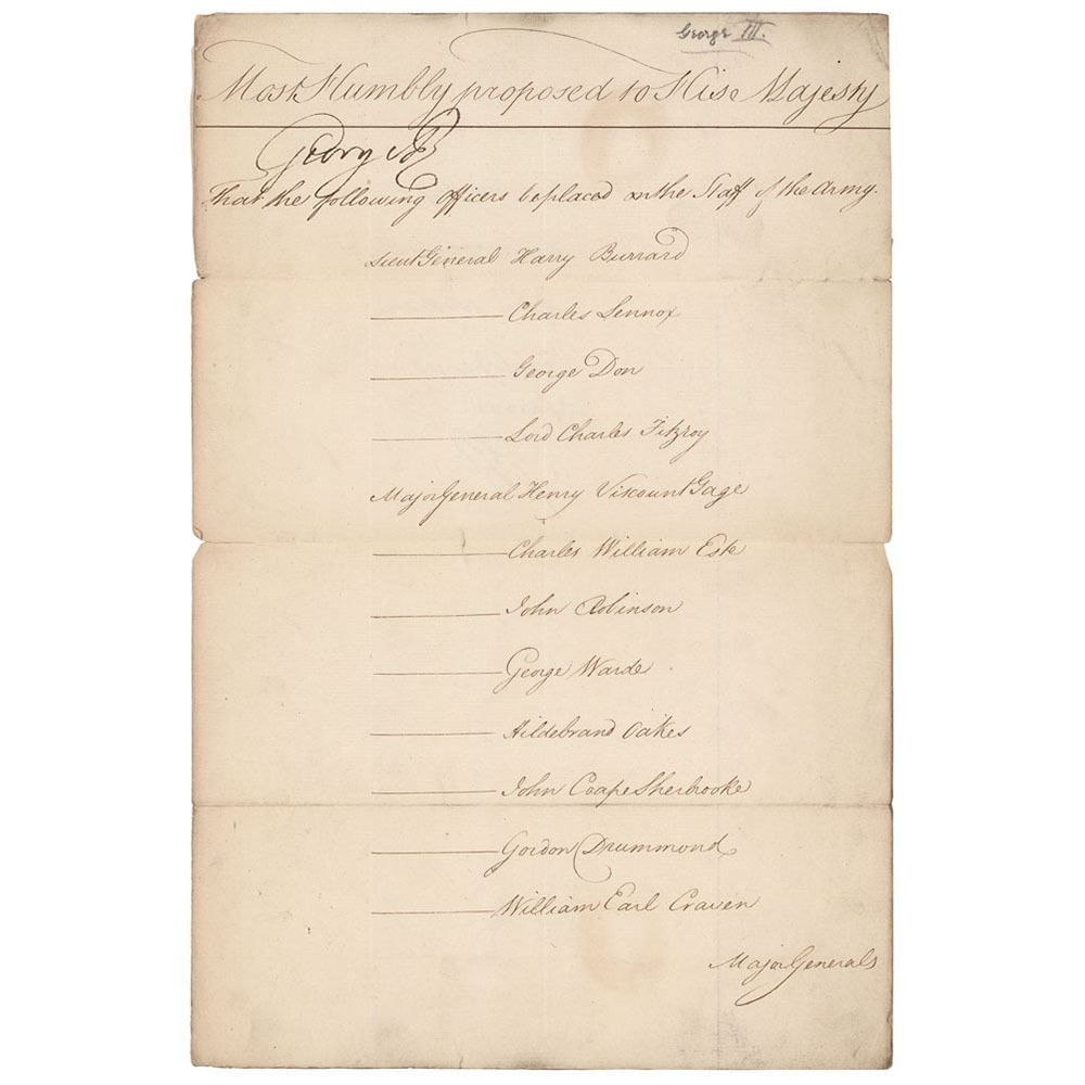 Manuscript DS, signed “George R†and "Approved, GR," one page both sides, 9.25 x 14, no date. Military document ordering several officers to "be placed on the Staff of the Army." Signed at the head by King George III, and also endorsed at the conclusion by the king. In very good to fine condition, with light creasing, and splitting to the folds and the hinge.