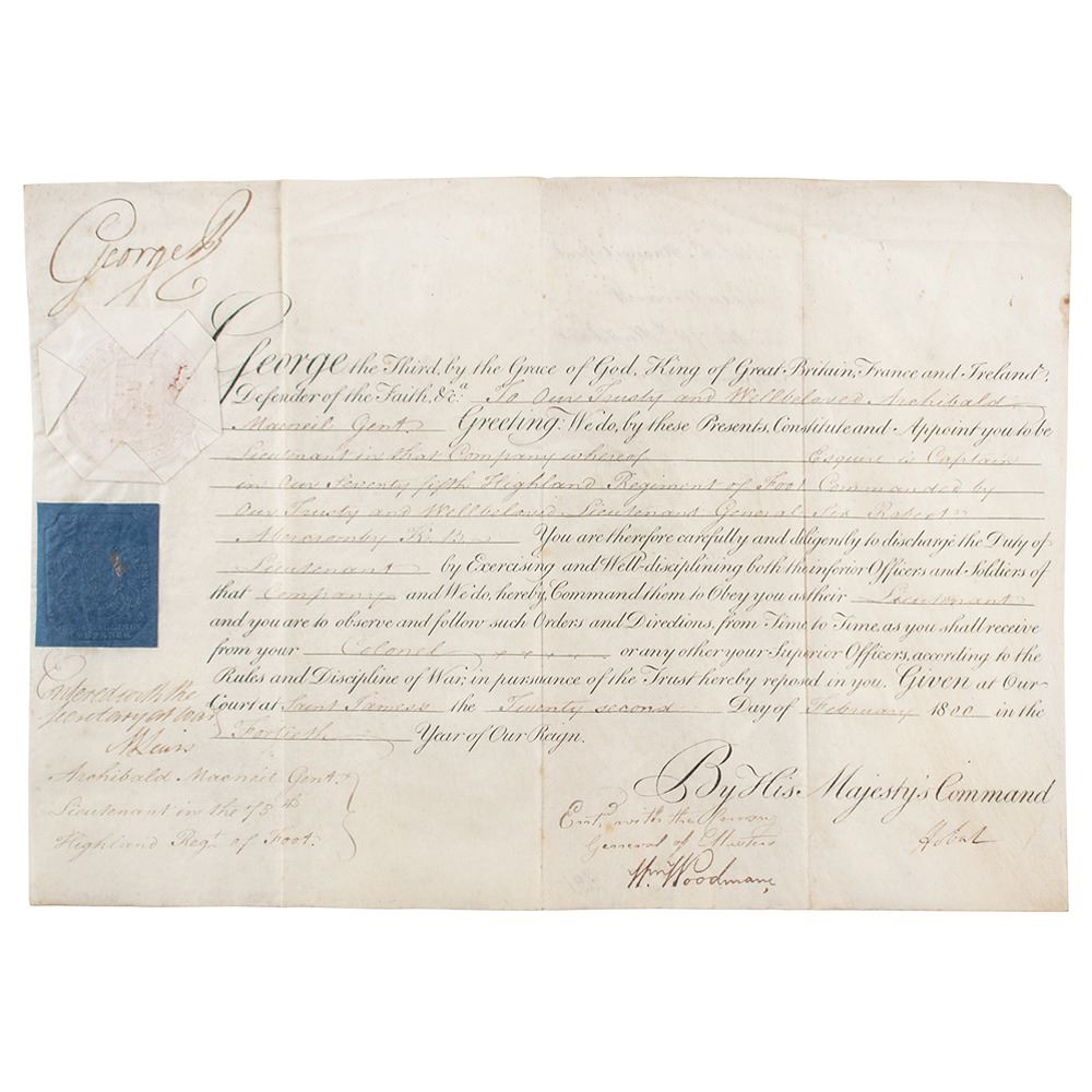 Partly-printed vellum DS, signed "George R," one page, 13.25 x 9.25, February 22, 1800. King George III appoints Archibald Macneil as "Lieutenant in that Company…in Our Seventy fifth Highland Regiment of Foot Commanded by Our Trusty and Wellbeloved Lieutenant General Sir Robert Abercromby K.B." Signed in the upper left by King George III and countersigned at the conclusion by Lord Hobart. The white embossed seal affixed to the upper left remains intact. In fine condition, with three vertical folds and some creasing along the top.