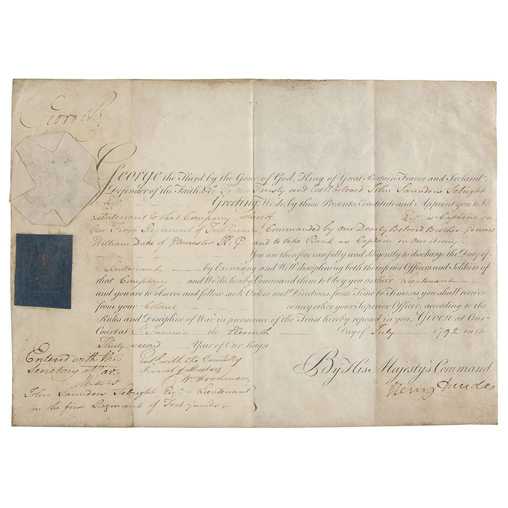 Partly-printed vellum DS, signed "George R," one page, 13.5 x 9.75, July 11, 1792. King George III appoints John Saunders Sebright as "Lieutenant to that Company"¦in Our First Regiment of Foot Guards, Commanded by our Dearly Beloved Brother General William Duke of Gloucester." Prominently signed at the head by King George III. The seals affixed below his signature remain intact. In fine condition, with light soiling, and some skipping to the signature.