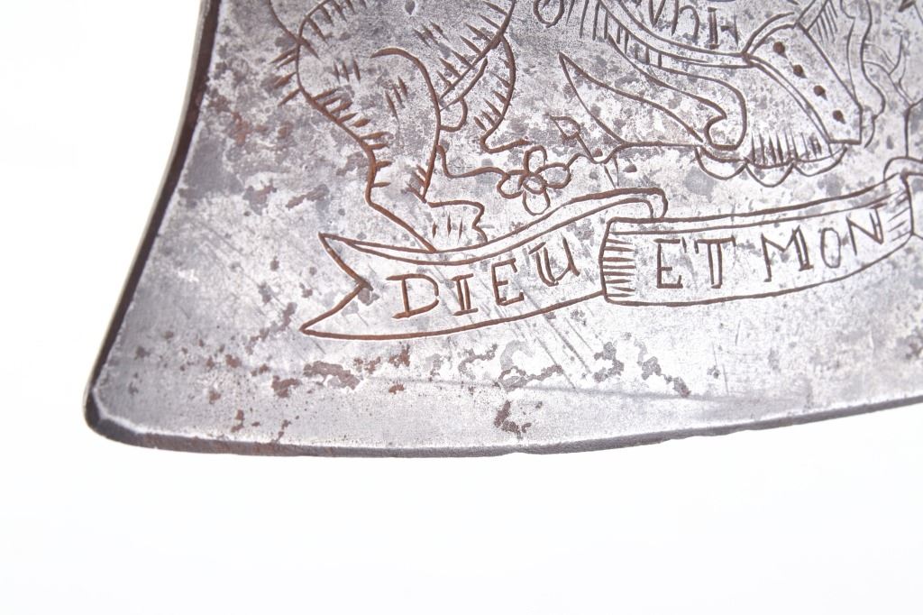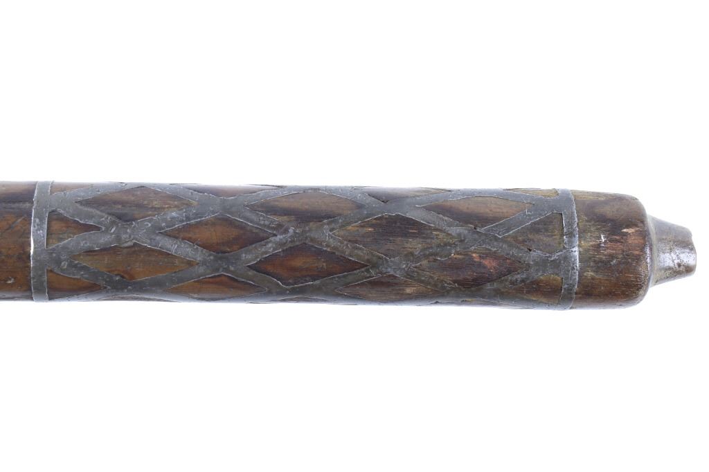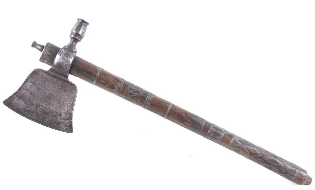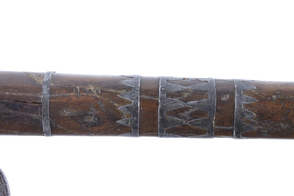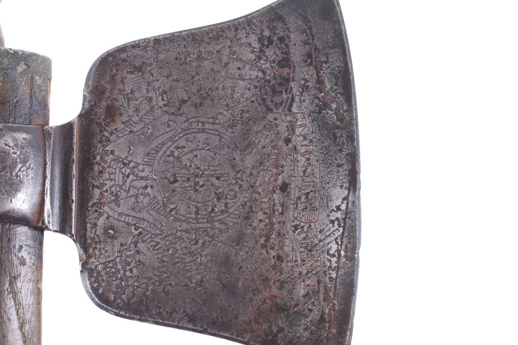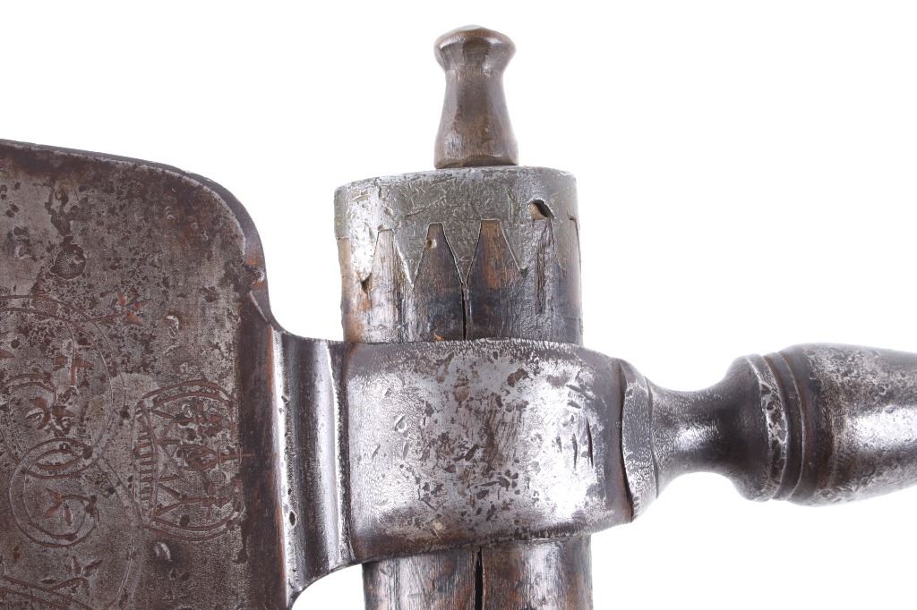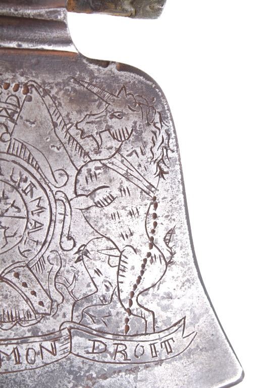 This is possibly one of the finest French and Indian Wars tomahawk to be brought to the public market. This example is highly engraved on the unique bell-shaped crescent curved forged iron blade showing the British Royal Coat of Arms with words “Diem Et Mon Droit” at the bottom banner and “Honi Soit Qui Mal Y (Pense)” at the round seal in the center. This is the official Coat of Arms of Great Britain used from circa 1714-1801. The reverse of the blade is engraved with the official Royal Monogram of King George III. This example is from the Mohawk Native American Indian tribe of the upper New York State who sided with their allies the British and due to the extremely high craftsmanship and finish of the tomahawk is believed to have been a presentation piece from King George III to the Chief of the Mohawk Indians. It is well documented that King Louis XV of the French presented Indian Chief allies with at least eight documented tomahawks during the seven years war, see the piece shown in Daniel D. Hartzler and James A. Knowles, “Tomahawks and Frontiersmen Belt Axes” figure 16 on page 123, which sold at auction May 2020 for $179,200 with premiums. The example being sold in this lot has a much higher craftsmanship and directly tied Royal British Coat of Arms engraving than the example previously mentioned. The head shows a forged iron with curved bell-like-shaped blade with crescent curved blade, stepped forged moldings at the base of the eyelet hole which is tear drop shaped flowing into the forge molding and filed step tall bowl which shows a vase shape flaring bevel with molded lines at the base. The right of the blade shows the Royal British Coat of Arms and the left side of the blade shows the official Royal Monogram of King George III of Great Britain with the Crown above an intertwined GR (showing a floral or leaf extension beautifully executed adding a fine artistic finish). The head is secured to the solid wood haft with the original hide gasket still present. The haft itself shows an incredible inlaid pewter finish. The end cap shows the original vase shaped clean out plug with pewter inlay having triangular teeth like finish. The haft further shows nearly a dozen bands of inlaid pewter inlays with diamond, zig-zag, triangular teeth like inlays and bands finish with the gripping area having a lattice like diamond pattern. The haft ends with a tapering carved smoking tip. The haft has a nice deep patina from honest age and use with dark honest coloring on the pewter. The head has a similar very honest patina from authentic age and use. The blade of the forged iron tomahawk is inset with a forged steel as exhibited by the forge line. Provenance: From a historic Eastern Montana American Indian Collection, where the piece was found to be an authentic original, one of the finest collections of American Indian weaponry and antiquities in Montana. The piece measure 20 5/8”L with a head that is 7 5/8”L by 5”W by 1 5/8” thick. This is truly a fantastic authentic tomahawk with outstanding engraving which ties the piece to such a phenomenal provenance.