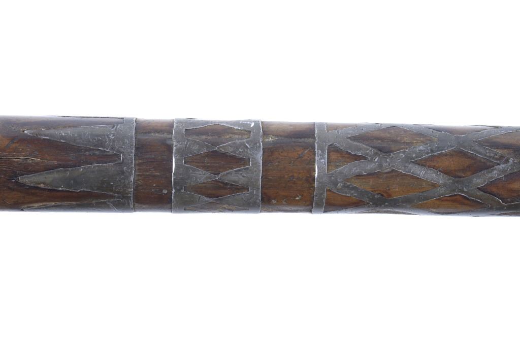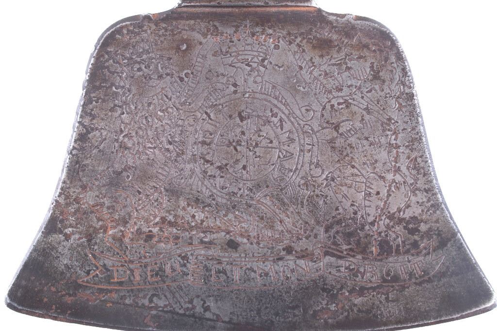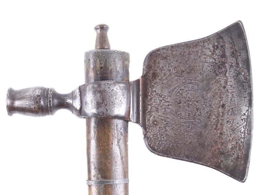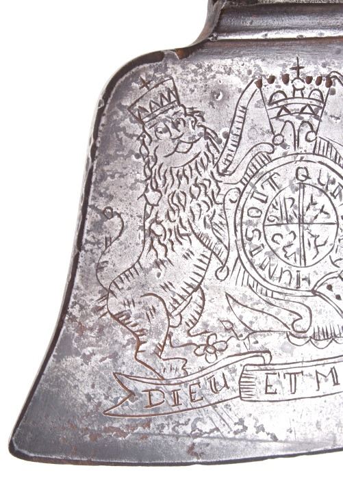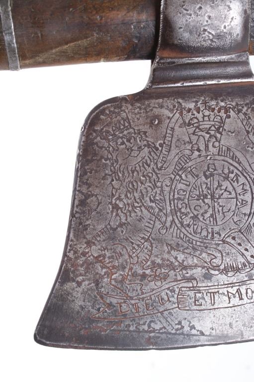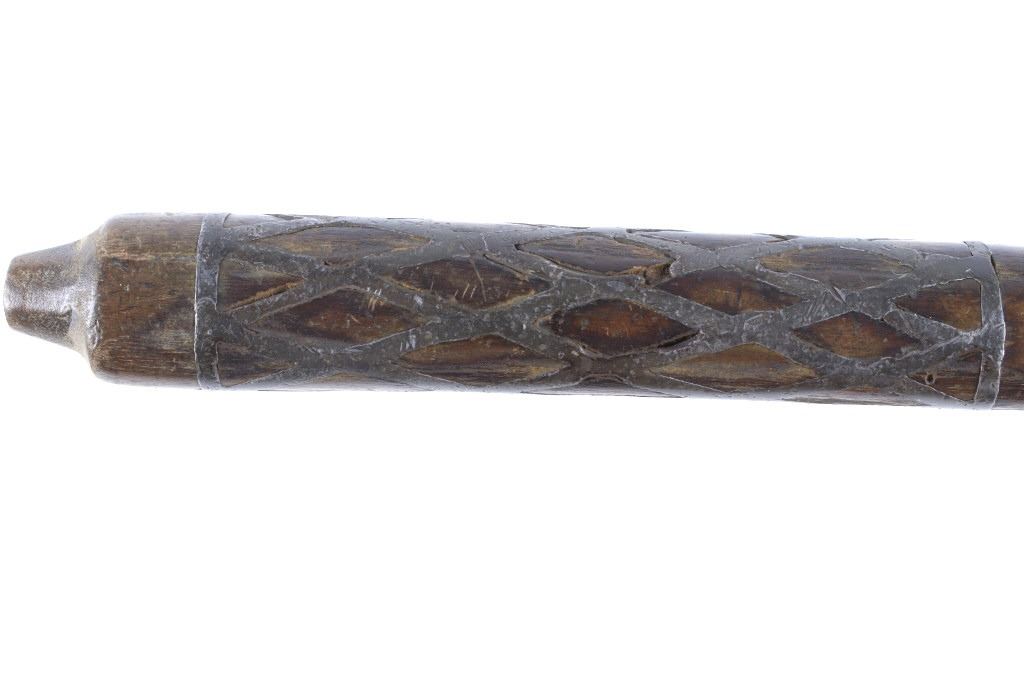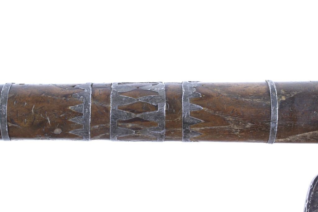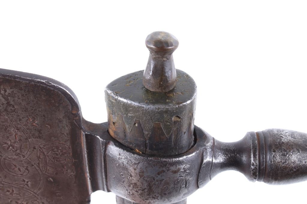 This is possibly one of the finest French and Indian Wars tomahawk to be brought to the public market. This example is highly engraved on the unique bell-shaped crescent curved forged iron blade showing the British Royal Coat of Arms with words “Diem Et Mon Droit” at the bottom banner and “Honi Soit Qui Mal Y (Pense)” at the round seal in the center. This is the official Coat of Arms of Great Britain used from circa 1714-1801. The reverse of the blade is engraved with the official Royal Monogram of King George III. This example is from the Mohawk Native American Indian tribe of the upper New York State who sided with their allies the British and due to the extremely high craftsmanship and finish of the tomahawk is believed to have been a presentation piece from King George III to the Chief of the Mohawk Indians. It is well documented that King Louis XV of the French presented Indian Chief allies with at least eight documented tomahawks during the seven years war, see the piece shown in Daniel D. Hartzler and James A. Knowles, “Tomahawks and Frontiersmen Belt Axes” figure 16 on page 123, which sold at auction May 2020 for $179,200 with premiums. The example being sold in this lot has a much higher craftsmanship and directly tied Royal British Coat of Arms engraving than the example previously mentioned. The head shows a forged iron with curved bell-like-shaped blade with crescent curved blade, stepped forged moldings at the base of the eyelet hole which is tear drop shaped flowing into the forge molding and filed step tall bowl which shows a vase shape flaring bevel with molded lines at the base. The right of the blade shows the Royal British Coat of Arms and the left side of the blade shows the official Royal Monogram of King George III of Great Britain with the Crown above an intertwined GR (showing a floral or leaf extension beautifully executed adding a fine artistic finish). The head is secured to the solid wood haft with the original hide gasket still present. The haft itself shows an incredible inlaid pewter finish. The end cap shows the original vase shaped clean out plug with pewter inlay having triangular teeth like finish. The haft further shows nearly a dozen bands of inlaid pewter inlays with diamond, zig-zag, triangular teeth like inlays and bands finish with the gripping area having a lattice like diamond pattern. The haft ends with a tapering carved smoking tip. The haft has a nice deep patina from honest age and use with dark honest coloring on the pewter. The head has a similar very honest patina from authentic age and use. The blade of the forged iron tomahawk is inset with a forged steel as exhibited by the forge line. Provenance: From a historic Eastern Montana American Indian Collection, where the piece was found to be an authentic original, one of the finest collections of American Indian weaponry and antiquities in Montana. The piece measure 20 5/8”L with a head that is 7 5/8”L by 5”W by 1 5/8” thick. This is truly a fantastic authentic tomahawk with outstanding engraving which ties the piece to such a phenomenal provenance.