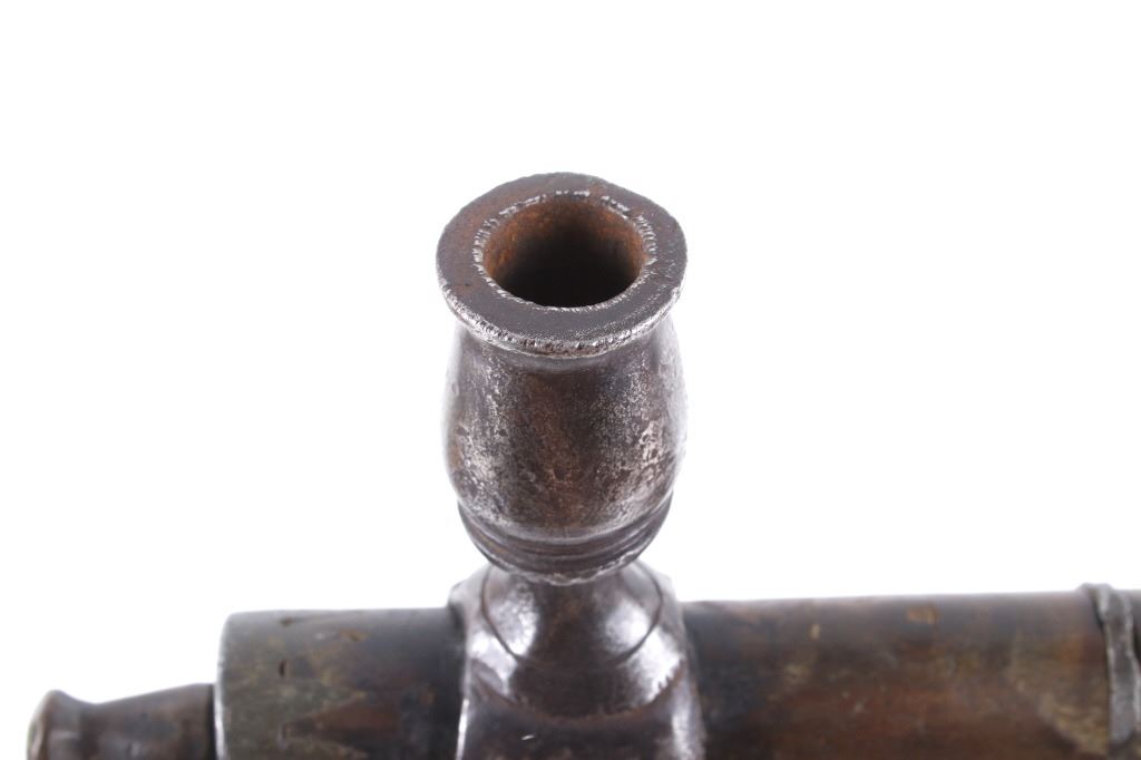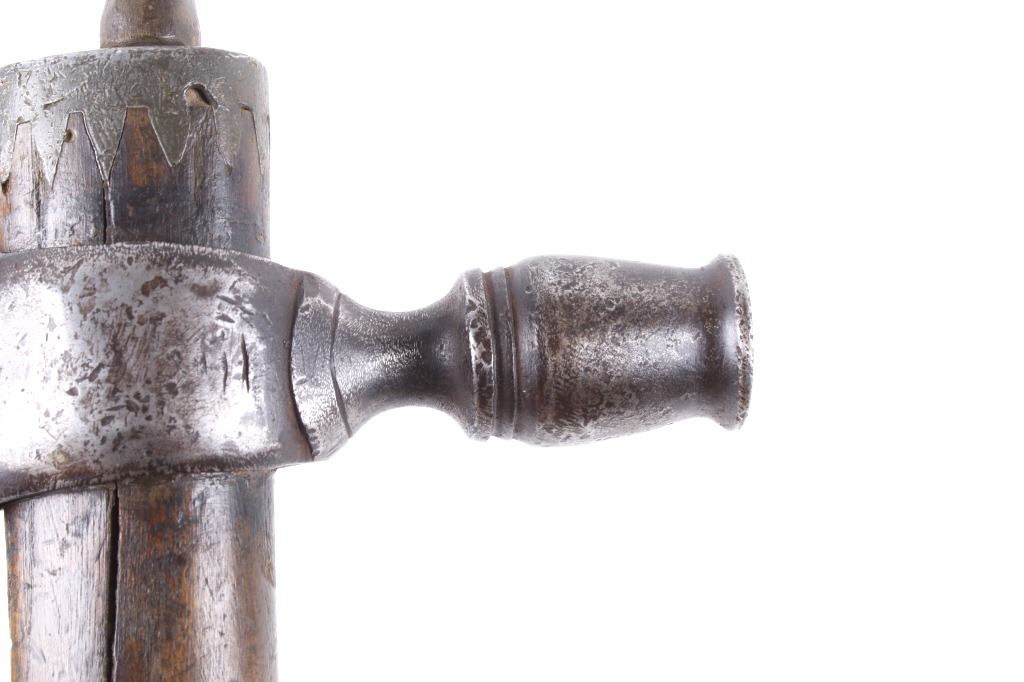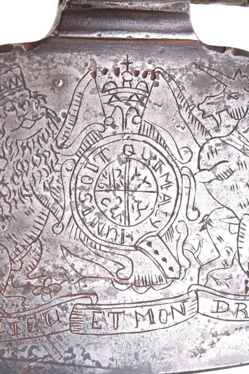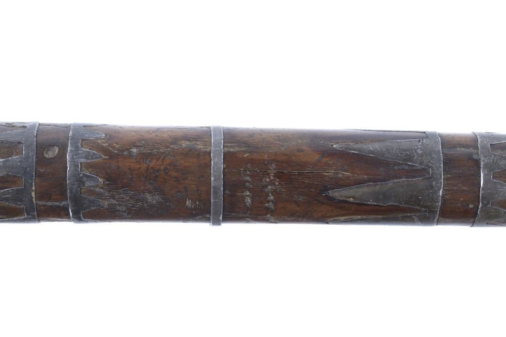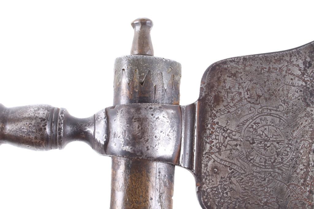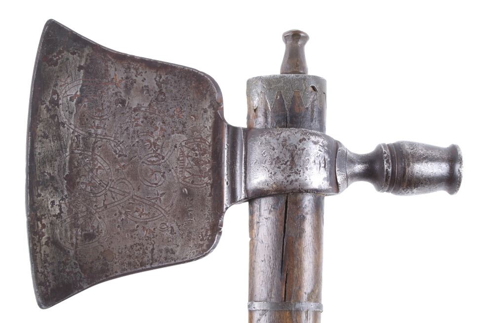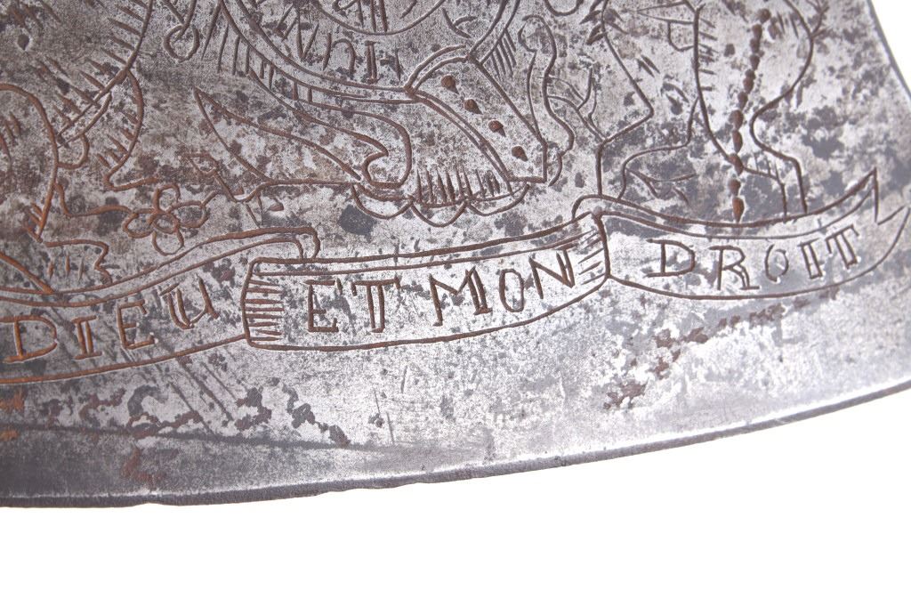 This is possibly one of the finest French and Indian Wars tomahawk to be brought to the public market. This example is highly engraved on the unique bell-shaped crescent curved forged iron blade showing the British Royal Coat of Arms with words “Diem Et Mon Droit” at the bottom banner and “Honi Soit Qui Mal Y (Pense)” at the round seal in the center. This is the official Coat of Arms of Great Britain used from circa 1714-1801. The reverse of the blade is engraved with the official Royal Monogram of King George III. This example is from the Mohawk Native American Indian tribe of the upper New York State who sided with their allies the British and due to the extremely high craftsmanship and finish of the tomahawk is believed to have been a presentation piece from King George III to the Chief of the Mohawk Indians. It is well documented that King Louis XV of the French presented Indian Chief allies with at least eight documented tomahawks during the seven years war, see the piece shown in Daniel D. Hartzler and James A. Knowles, “Tomahawks and Frontiersmen Belt Axes” figure 16 on page 123, which sold at auction May 2020 for $179,200 with premiums. The example being sold in this lot has a much higher craftsmanship and directly tied Royal British Coat of Arms engraving than the example previously mentioned. The head shows a forged iron with curved bell-like-shaped blade with crescent curved blade, stepped forged moldings at the base of the eyelet hole which is tear drop shaped flowing into the forge molding and filed step tall bowl which shows a vase shape flaring bevel with molded lines at the base. The right of the blade shows the Royal British Coat of Arms and the left side of the blade shows the official Royal Monogram of King George III of Great Britain with the Crown above an intertwined GR (showing a floral or leaf extension beautifully executed adding a fine artistic finish). The head is secured to the solid wood haft with the original hide gasket still present. The haft itself shows an incredible inlaid pewter finish. The end cap shows the original vase shaped clean out plug with pewter inlay having triangular teeth like finish. The haft further shows nearly a dozen bands of inlaid pewter inlays with diamond, zig-zag, triangular teeth like inlays and bands finish with the gripping area having a lattice like diamond pattern. The haft ends with a tapering carved smoking tip. The haft has a nice deep patina from honest age and use with dark honest coloring on the pewter. The head has a similar very honest patina from authentic age and use. The blade of the forged iron tomahawk is inset with a forged steel as exhibited by the forge line. Provenance: From a historic Eastern Montana American Indian Collection, where the piece was found to be an authentic original, one of the finest collections of American Indian weaponry and antiquities in Montana. The piece measure 20 5/8”L with a head that is 7 5/8”L by 5”W by 1 5/8” thick. This is truly a fantastic authentic tomahawk with outstanding engraving which ties the piece to such a phenomenal provenance.