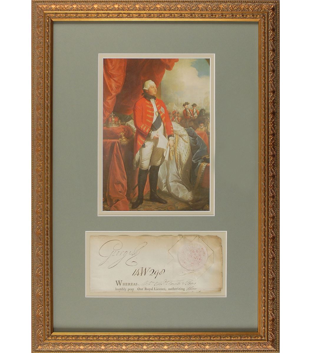 Ink signature, “George R,” on an off-white 8 x 3.5 slip clipped from a larger document. Retains the original official paper seal affixed to the right side. Nicely double-matted and framed with a full-length portrait of the King to an overall size of 15.25 x 21.75. In fine condition, with light toning and wear to trimmed edges (most prevalent along right side).