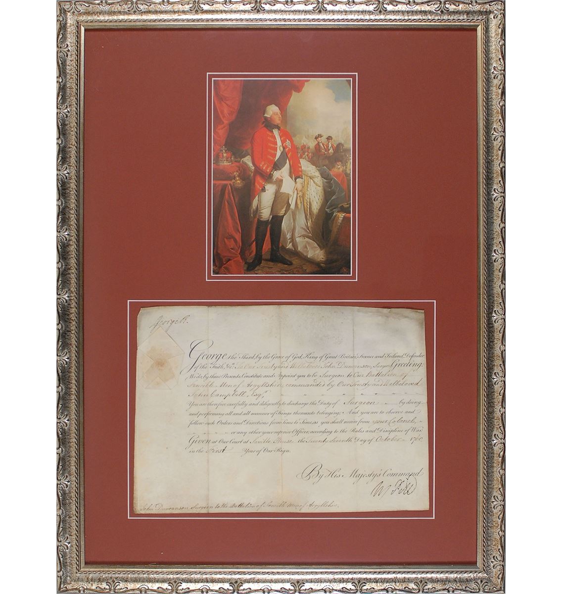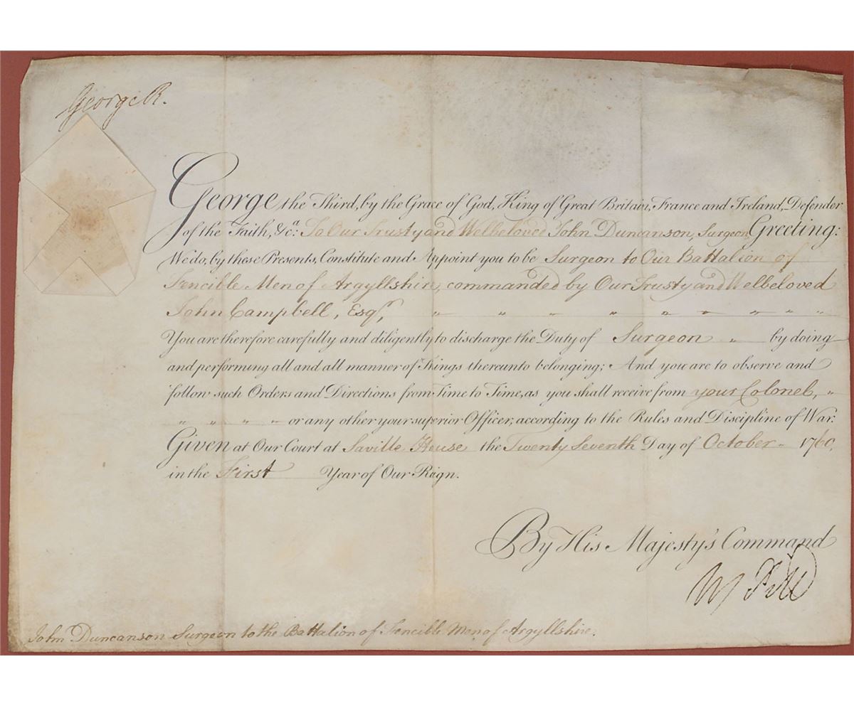 King of Great Britain and Ireland from 1760 until his death in 1820 whose reign was marked most notably by the loss of British control over the American colonies. Partly-printed vellum DS, signed “George R,” one page, 13.75 x 9.5, October 27, 1760. King George appoints John Duncanson to be “Surgeon to Our Battalion of Fencible Men of Argyllshire, commanded by Our Trusty and Welbeloved John Campbell.” Signed in the upper left by King George III and countersigned by William Pitt the Elder. The white paper seal affixed to the upper left remains fully intact. Impressively double-matted and framed with a color image of the king to an overall size of 21 x 28. In very good condition, with three heavy vertical folds, and scattered creases and soiling; both signatures are especially strong and bold. The plan of raising a fencible corps in the Highlands was first proposed and carried into effect by William Pitt the Elder in 1759. Dating to the following year, this exceedingly early appointment was signed on just the third day of King George’s reign.