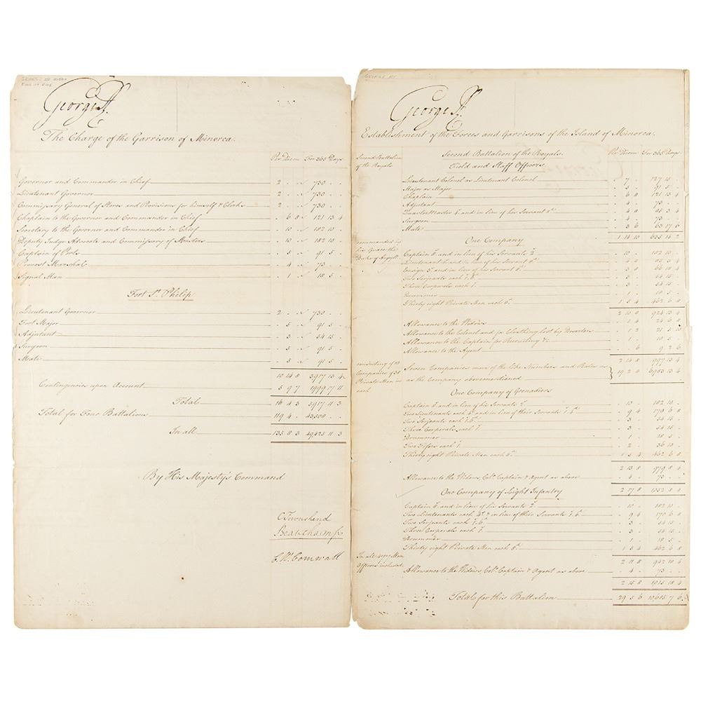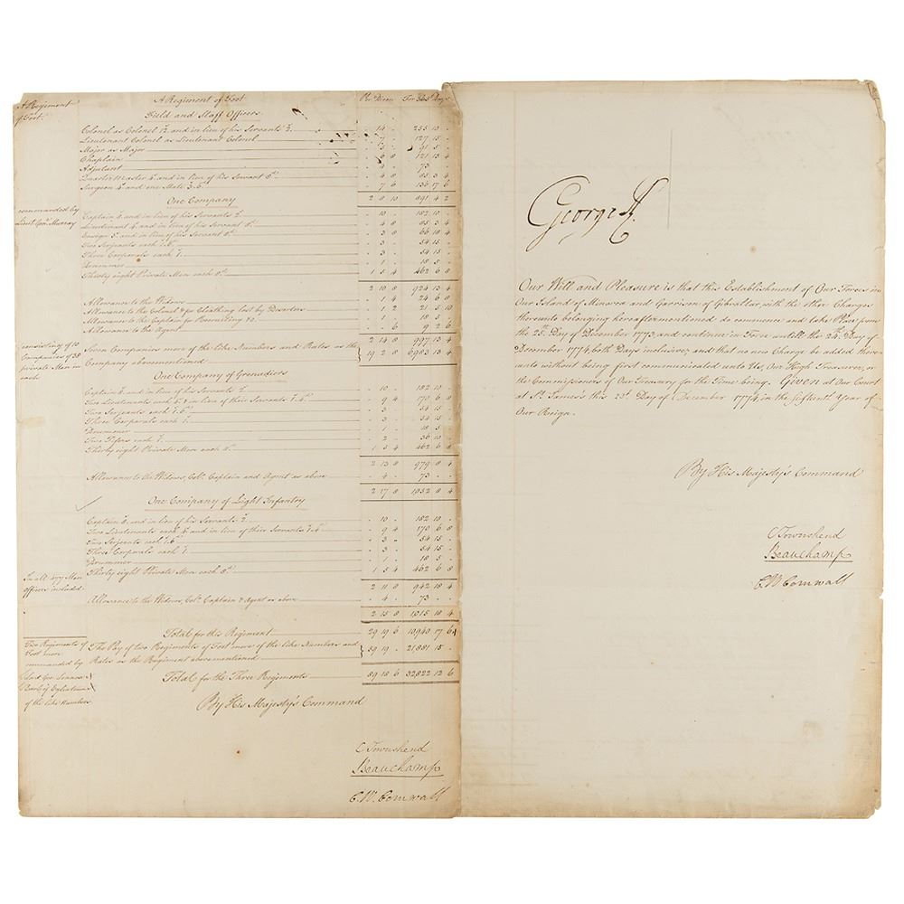 Manuscript DS, signed “George R,” two pages both sides, 11.5 x 19, December 23, 1774. Significant military document outlining the "Establishment of Our Forces in Our Island of Minorca and Garrison of Gibraltar," boldly and prominently signed at the head three times by King George III. Also signed three times by Charles Townshend, Viscount Beauchamp, and Charles Wolfran Cornwall as Lords Commissioners of the Treasury. The document describes the strengths of the companies to be stationed there, names the commanders, and gives their per diem and annual rates of pay. In very good to fine condition, with partial splitting along the folds. A superb document boasting three huge signatures of King George III, signed just prior to the outbreak of the American Revolution.