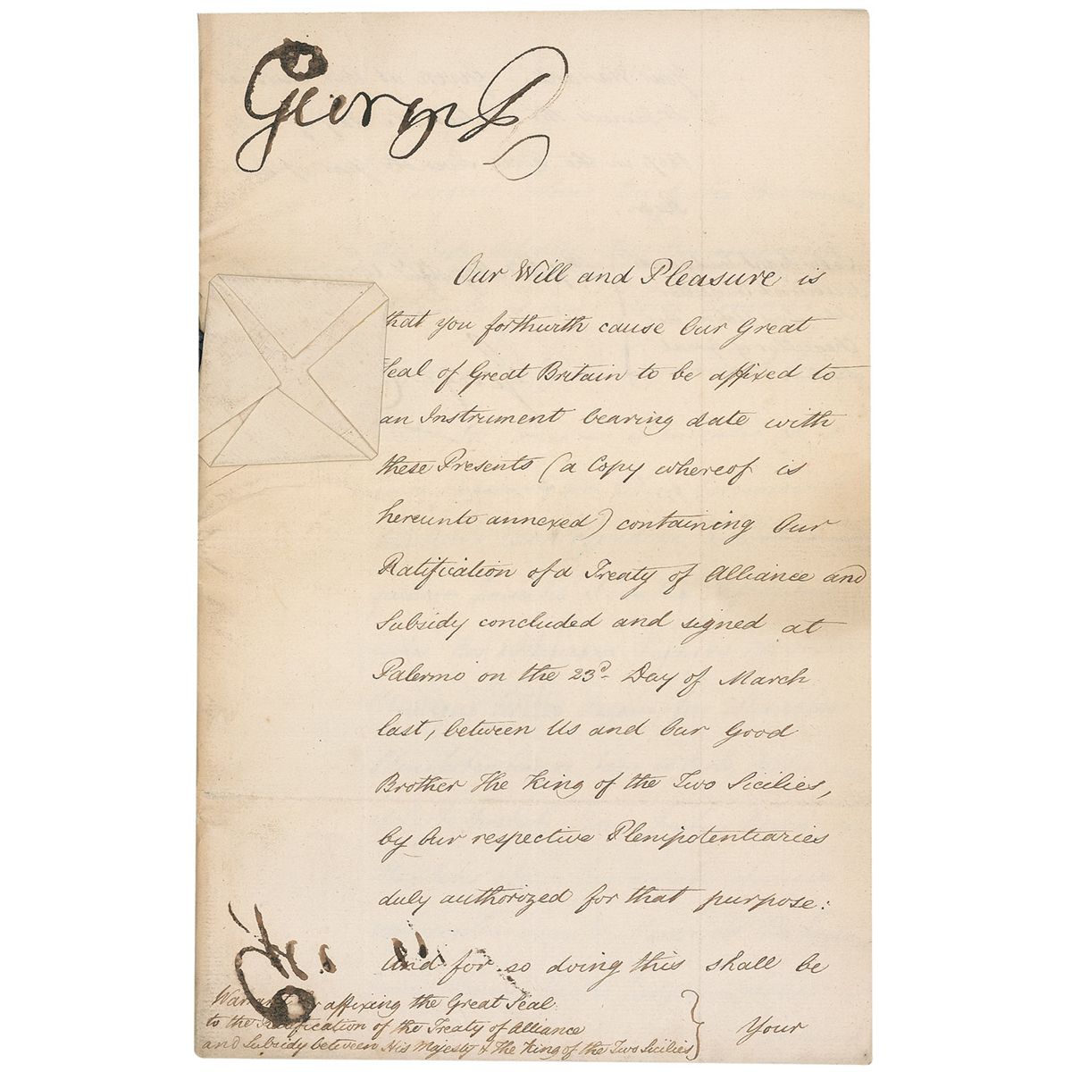 King of Great Britain and Ireland (born 1738) from 1760 until his death in 1820. His reign was marked most notably by the loss of British control over the American colonies. Advancing mental illness rendered George unable to fulfill his official duties during the last decade of his life, during which time the Prince Regent, William IV, ruled in his stead. DS, in English and French, signed “George R,” nineteen pages on 10 adjoining sheets, 7.75 x 12, July 16, 1807. Document issued to the Chancellor of Great Britain, John, Lord Eldon, authorizing him to affix the Great Seal of Great Britain to “an instrument bearing date with these Presents (a Copy of whereof is hereunto annexed) containing Our Ratification of a Treaty of Alliance and Subsidy concluded and signed at Palermo…between us and Our Good brother The King of the two Sicilies [Ferdinand I], by her respective Plenipotentiaries duly authorized for that purpose.” The remaining pages, in French, contain the particulars of the 13 Articles of the Treaty of Alliance and Subsidy. Intersecting folds, mild toning to pages, some mirroring of signature along bottom of first page, otherwise fine condition. The embossed seal is crisp and intact.