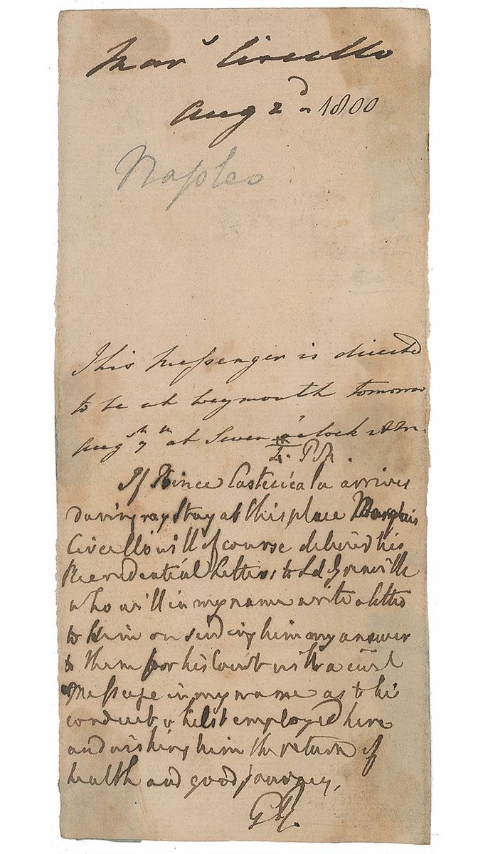 ALS signed “G. R.,” one page, 3.25 x 7.25, August 2, 1800. King George writes regarding the arrival of a prince. In very good condition, with scattered toning and soiling.