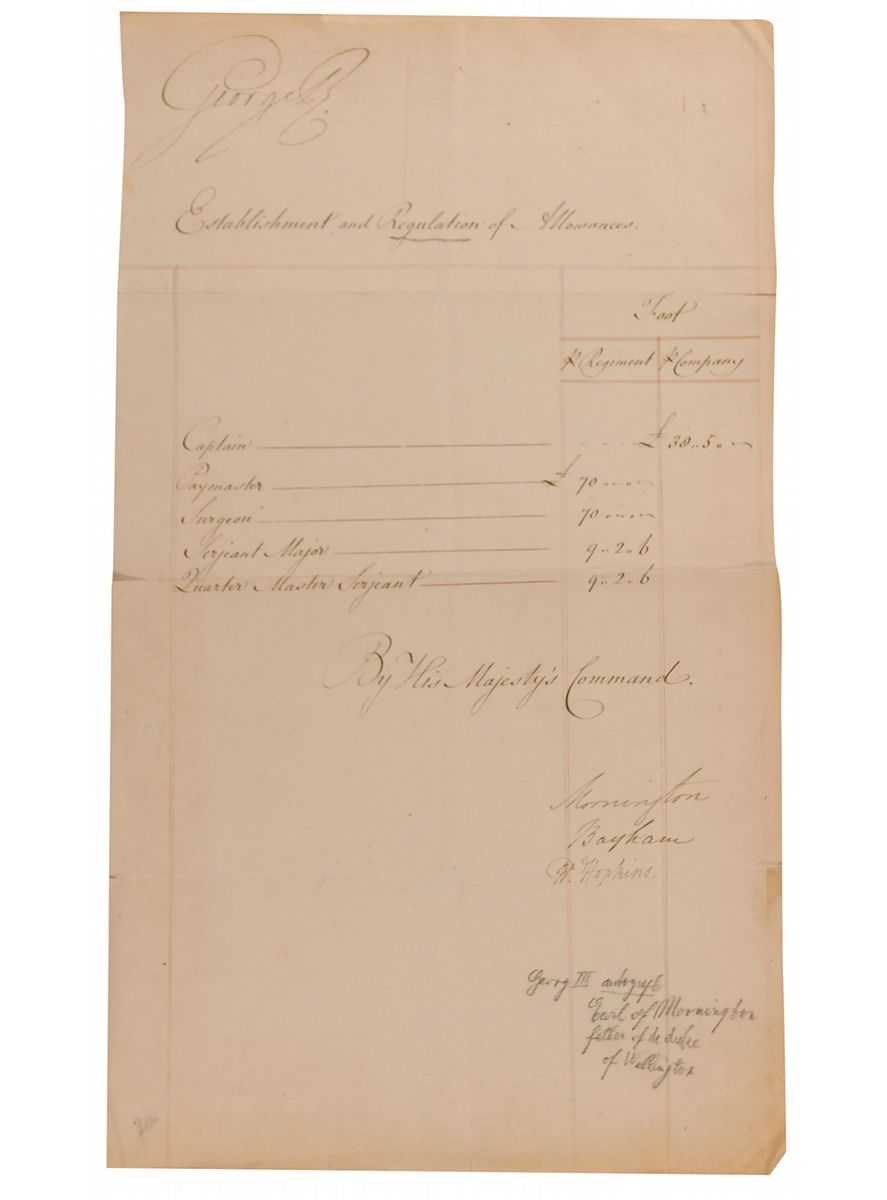 DS, signed “George R.,” one page, 10.5 x 18, no date. Document entitled “Establishment and Regulation of Allowances,” listing pay for troops, including the “Captain,” “Paymaster,” “Surgeon,” “Serjeant Major,” and “Quarter Master Serjeant.” Signed in the upper left by King George. Also signed at the conclusion by the Earl of Mornington, father of the Duke of Wellington. Slight separations to storage folds, light toning and small tears to edges, and a pencil notation to bottom, otherwise fine condition.