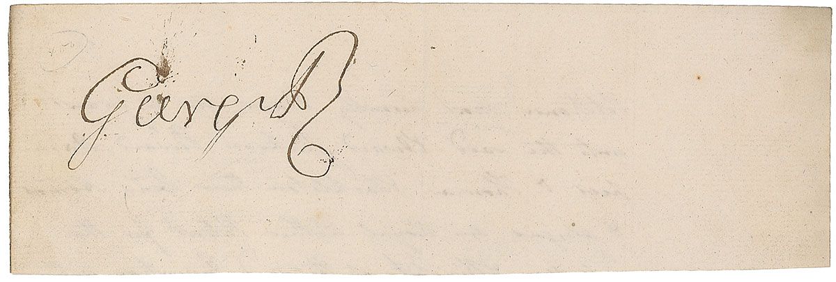 Ink signature, “George R,” on an off-white 7.75 x 2.5 slip clipped from a letter issuing a patent. In fine condition, with a light vertical fold through a single letter of signature and a few stray ink marks around signature. Accompanied by an unsigned engraved portrait.