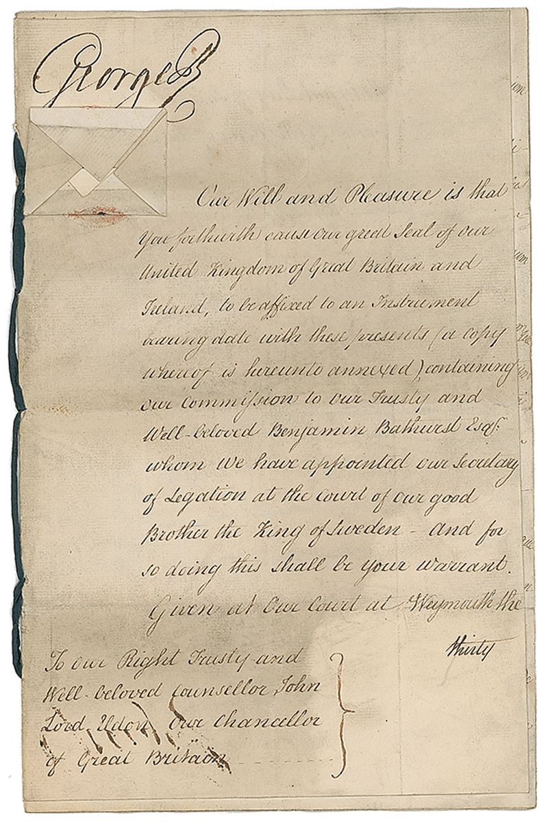 King of Great Britain and Ireland from 1760 until his death in 1820 whose reign was marked most notably by the loss of British control over the American colonies. Manuscript DS, boldly signed “George R,” five pages on two sets of ribbon-bound adjoining sheets, 8 x 12.25, July 31, 1803. Document ordering that the seal of the United Kingdom be affixed to a document appointing Benjamin Bathurst as “our secretary of legation at the court of our good brother the King of Sweden.” The remaining pages consist of a manuscript copy of the appointment. Paper seal affixed below George’s signature remains fully intact with corners folded. In fine condition, with scattered soiling and expected document wear.