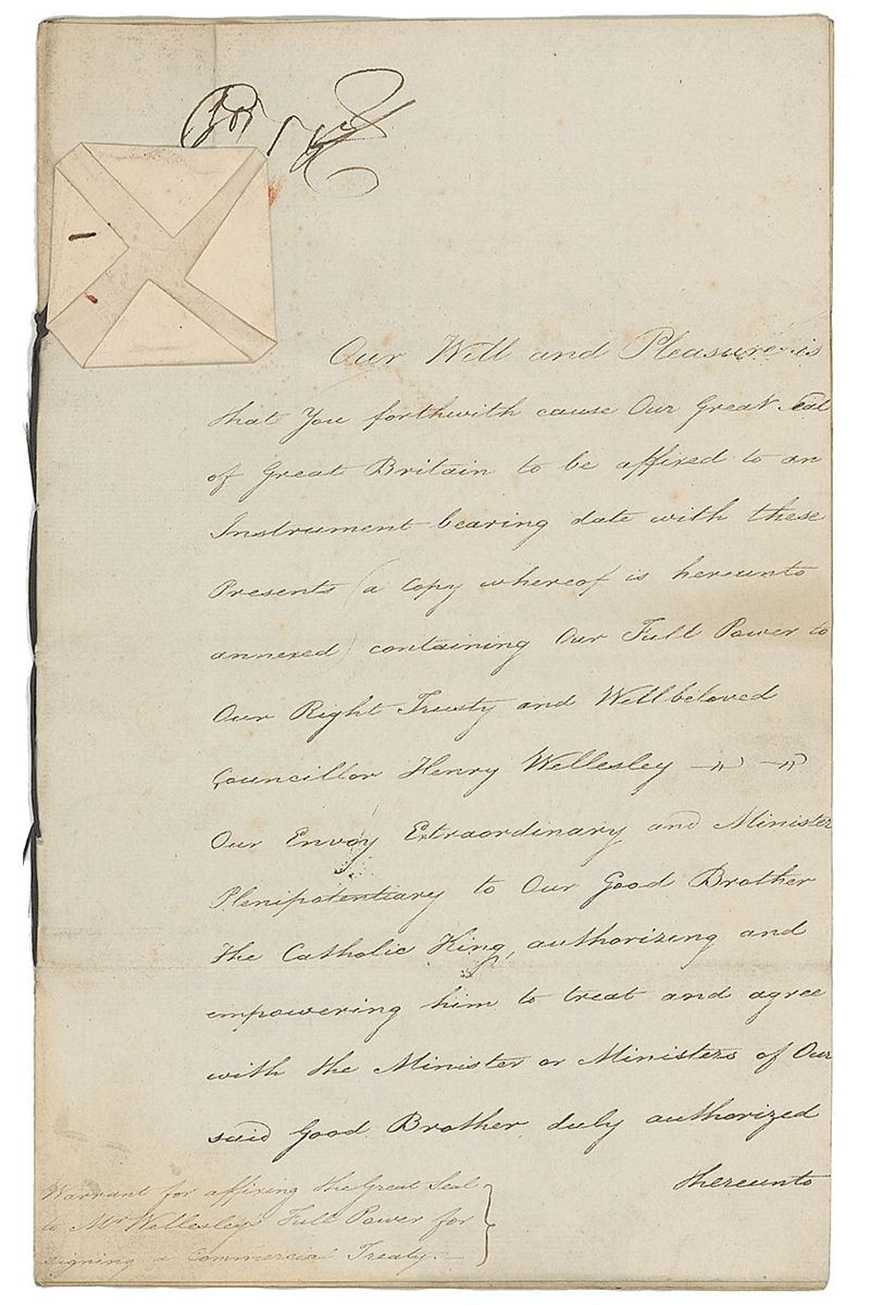 King of Great Britain and Ireland from 1760 until his death in 1820 whose reign was marked most notably by the loss of British control over the American colonies. Manuscript DS, signed “George R,” five pages adjoined on three sheets, 7.75 x 12.5, May 1, 1810. The King orders the Great Seal of Great Britain “to be affixed to an instrument…to our Right Trusty and Well beloved Councillor Henry Wellesley our Envoy Extraordinary and Minister Plenipotentiary to our Good Brother the Catholic King.” Following three pages are in Latin. Quickly signed at the top of the first page by the king. In fine condition, with expected folds and some scattered light soiling. The paper seal is crisp and intact and document is still bound by its original ribbon.