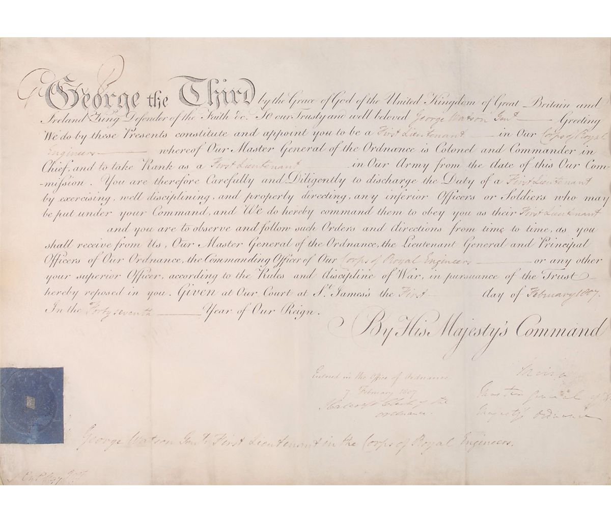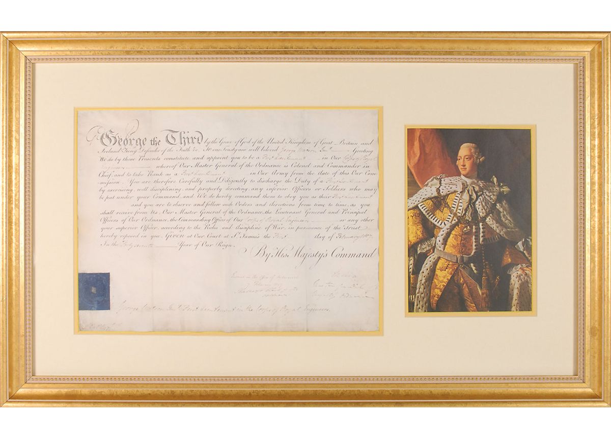 Partly-printed vellum DS, signed “George R,” one page, 15.25 x 11, February 1, 1807. King George appoints George Watson to be “a First Lieutenant in our Corps of Royal Engineers.” Signed in the upper left by George, signing partially over his printed name due to his failing eyesight at the time. The blue seal affixed to the lower left remains crisp and intact. Double-matted and framed with a color image of the king to an overall size of 31 x 19. Intersecting folds and expected document wear, otherwise fine condition. Oversized.