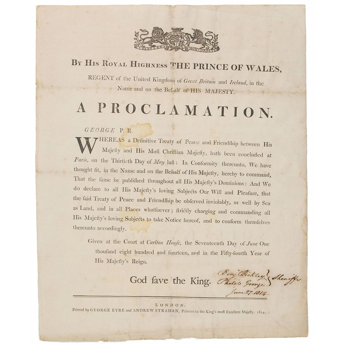 Printed proclamation, not signed by the King, one page, 12.25 x 15, dated June 27, 1814, signed at the conclusion by sheriffs Benjamin Bickley and Philip George. Document reads, in part: “Whereas a Definitive Treaty of Peace and Friendship between His Majesty and His Most Christian Majesty, hath been concluded at Paris, on the Thirtieth Day of May last…We do declare to all His Majesty's loving Subjects Our Will and Pleasure, that the said Treaty of Peace and Friendship be observed inviolably, as well by Sea as Land." Document also bears George’s printed name, “George P. R.,” above the beginning of the text. Document has been professionally linen-backed. In very good condition, with intersecting folds, and scattered toning, staining, and foxing, as well as a few spots of minor paper loss along central vertical fold and edges. The 1814 Treaty of Paris, signed on May 30, 1814, ended the war between France and the Sixth Coalition, and also enforced the abdication of Napoleon I, who was exiled to Elba.