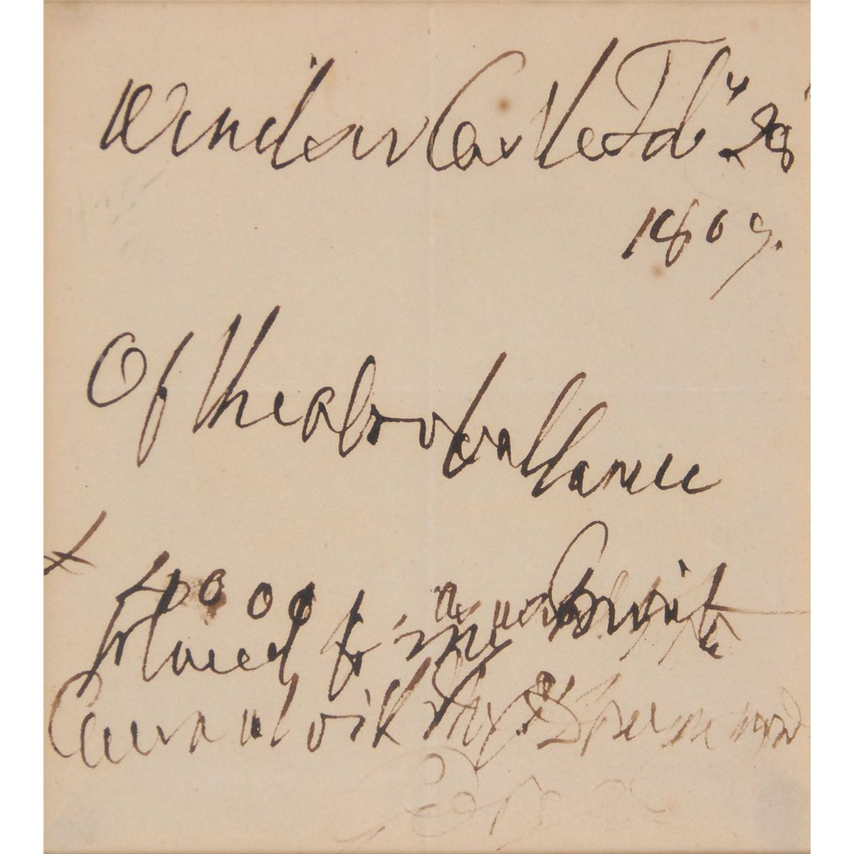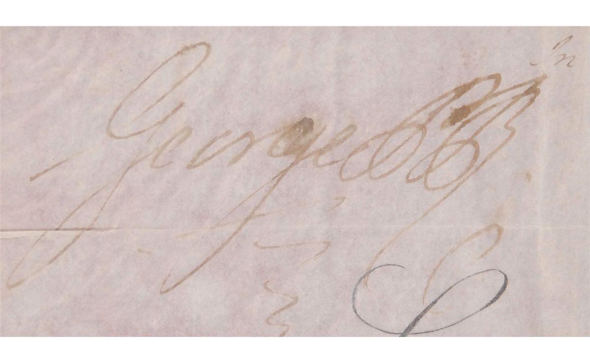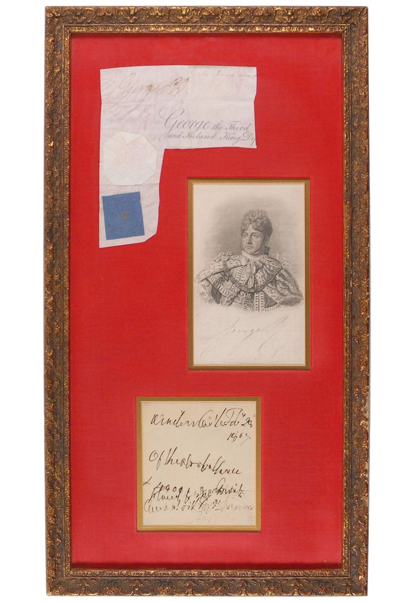 Early ink signature, “George PR,” on an off-white 6 x 7 slip clipped from a larger document, still retaining the seals affixed below the signature; and a later ANS lightly signed “George R,” one page, 4.5 x 5, February 28, 1809, concerning a financial matter. Double-matted with an engraved portrait to an overall size of 13 x 24. In fine condition, with intersecting folds and slight brushing to ink to the clipped signature; and the signature concluding the letter quite light due to poor ink flow.