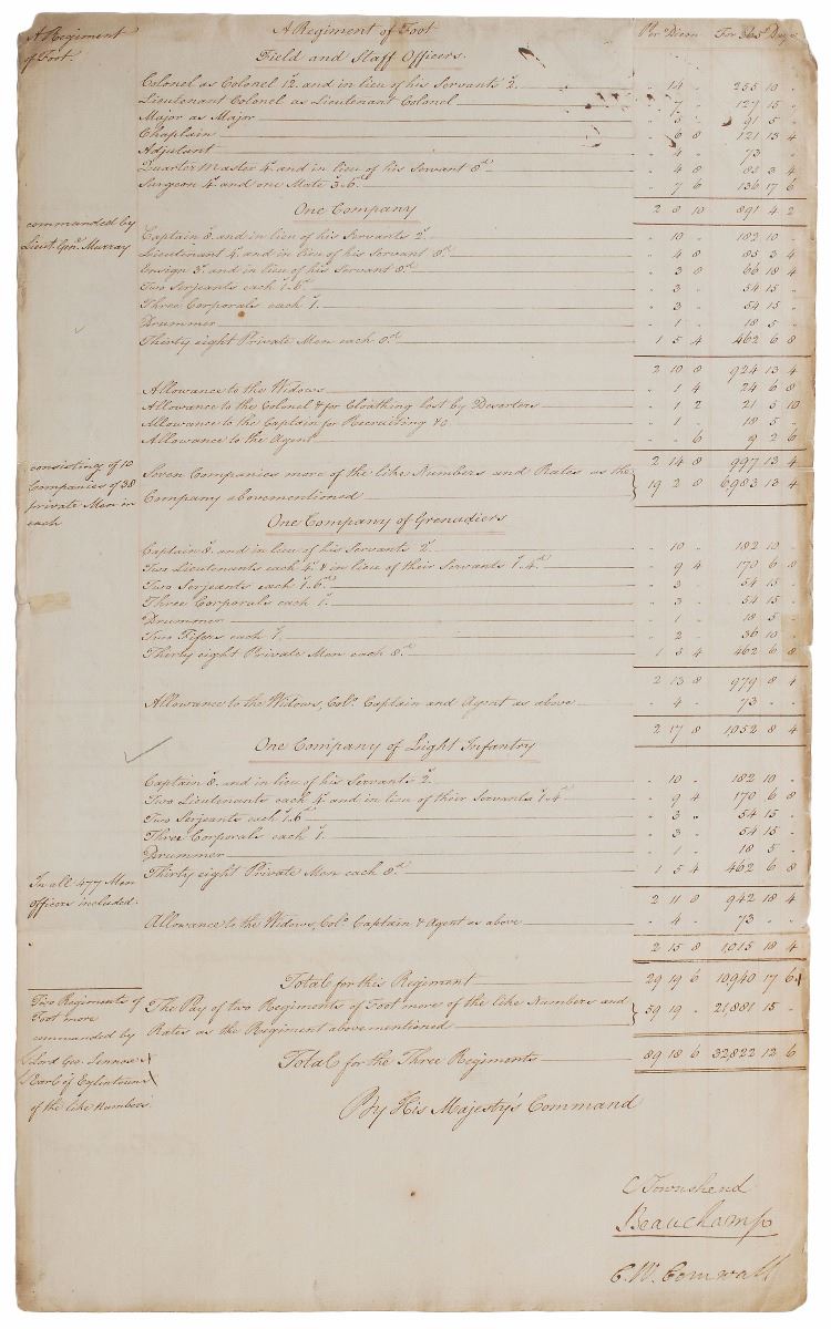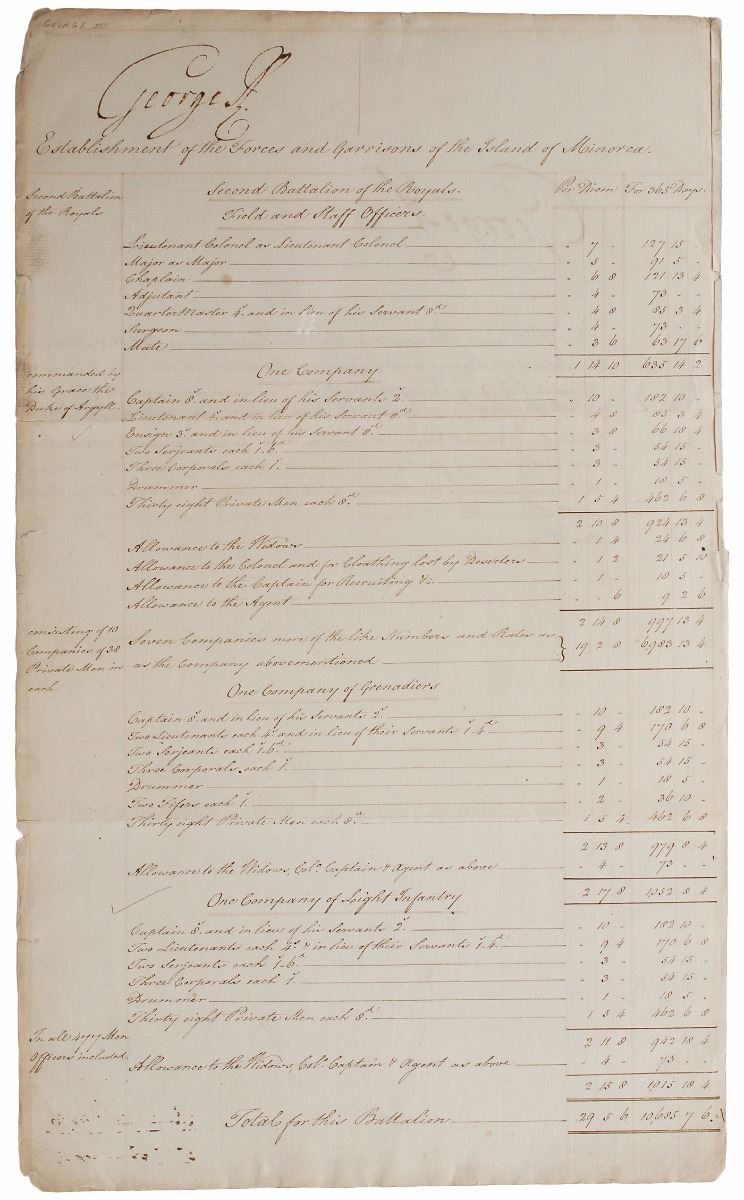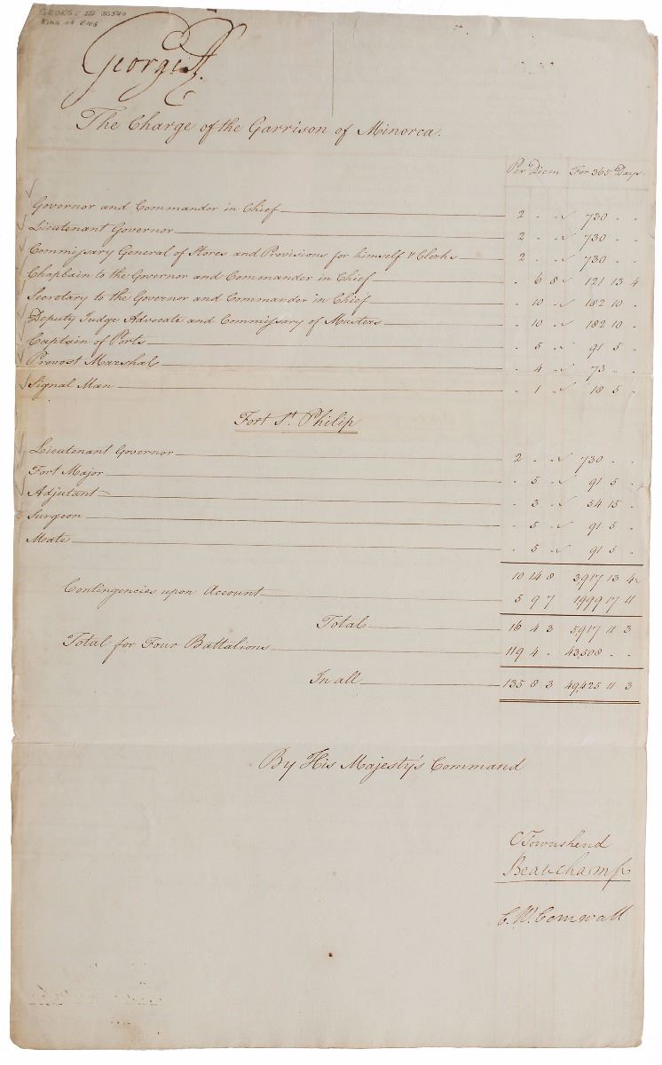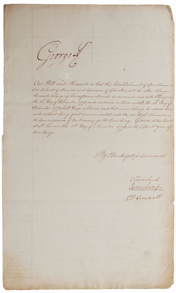 Manuscript DS, signed three times, “George R,” two pages both sides, 11.5 x 19, December 23, 1774. Unusual document pertaining to troops stationed on the island of Minorca, detailing per diem pay for various ranks of soldiers. Prominently signed three times at the top by the king, with each page also countersigned at the conclusion by three officials. In fine condition. The British had taken possession of Minorca following their victory in the Seven Years’ War, but a combined force of Spanish and French troops took it back in 1781. An interesting piece from a tumultuous period of British history.