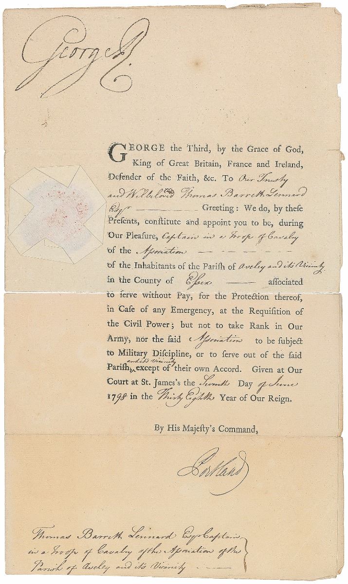 DS, signed “George R,” one page, 8 x 13.75, June 7, 1798. King George appoints Thomas Barrett Lennard as “Captain in a Troop of Cavalry of the Association of the Parish of Aveley and its Vicinity.” Beautifully signed at the top by King George. The paper seal affixed to the left side remains fully intact. In very good to fine condition, with a clean complete separation to the central horizontal fold.