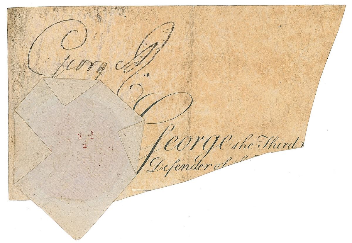 King of Great Britain and Ireland from 1760 until his death in 1820, whose reign was most notably marked by the American Revolution. Ink signature, “George R,” on an off-white 6 x 3.5 vellum slip clipped from a larger document. The white paper seal affixed to the left side remains intact. In very good to fine condition, with moderate overall soiling.