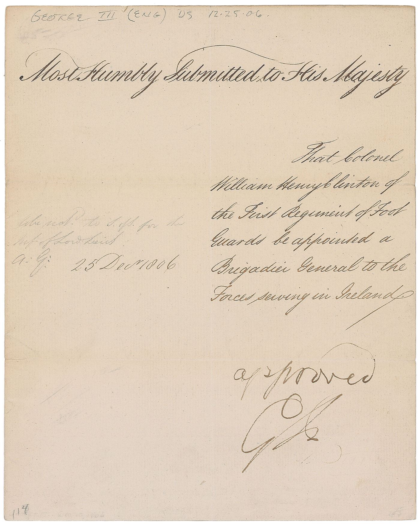 Manuscript DS, signed “approved, GR,” one page, 7.5 x 9.5, December 25, 1806. King George approves a military promotion. In full: “Most humbly submitted to His Majesty, That Colonel William Henry Clinton of the First Regiment of Foot Guards be appointed a Brigadier General to the Forces serving in Ireland.” In fine condition, with intersecting folds and expected document wear.
