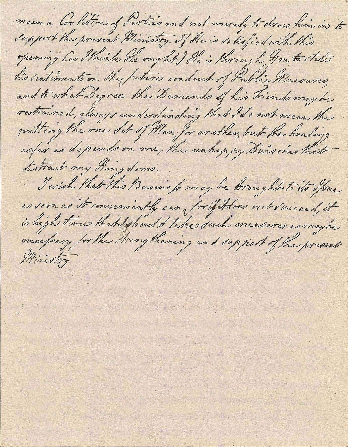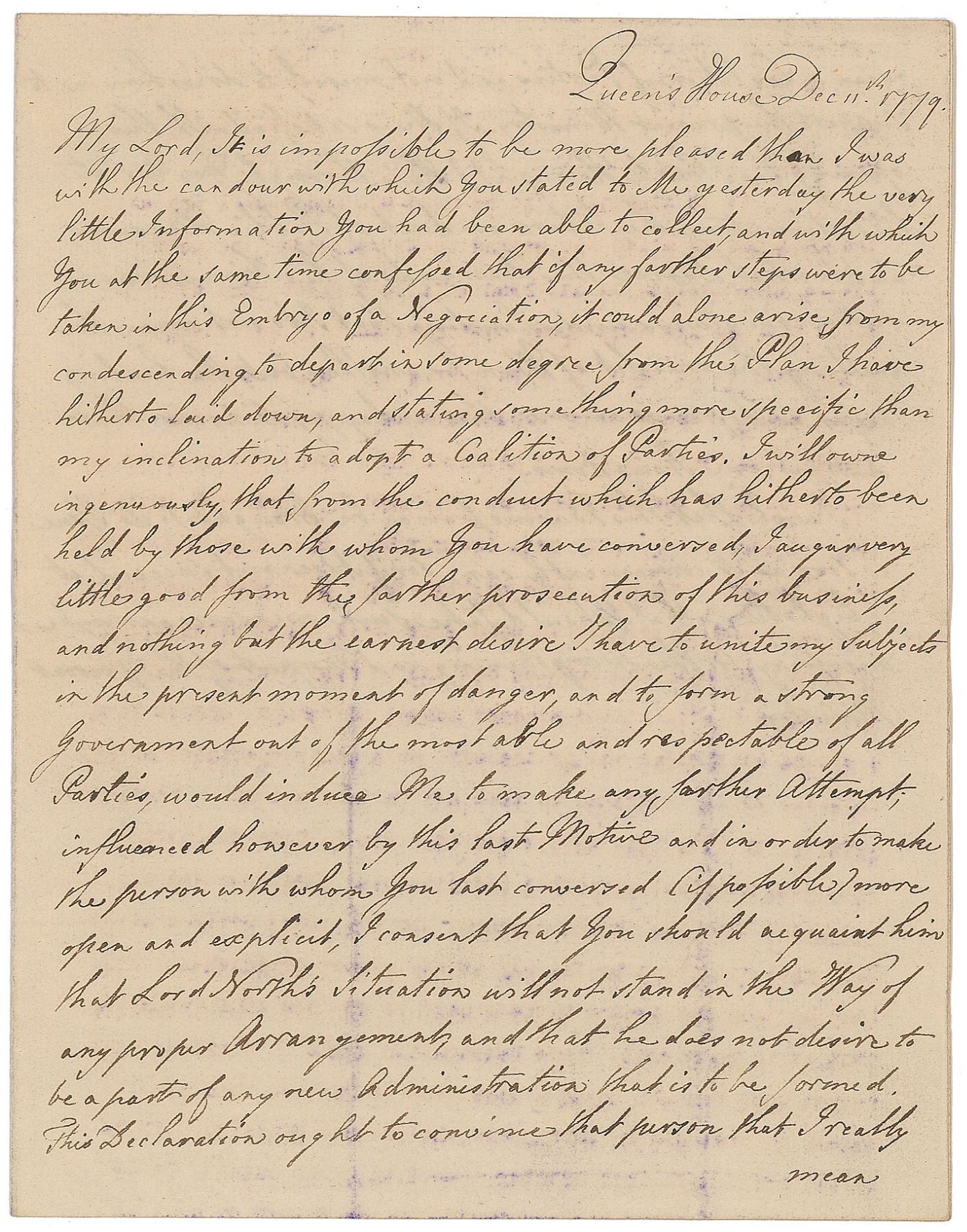 Revolutionary War–dated handwritten letter by King George III, unsigned, one page both sides, 7.25 x 9.5, December 11, 1779. Letter to Lord Thurlow, in full: "It is impossible to be more pleased than I was with the candour with which you stated to Me yesterday the very little Information you had been able to collect, and with which you at the same time confessed that if any farther steps were to be taken in this Embryo of a Negociation, it could alone arise from my condescending to depart in some degree from the Plan I have hitherto laid down, and stating something more specific than my inclination to adopt a Coalition of Parties. I will owne ingenuously, that from the conduct which has hitherto been held by those with whom you have conversed, I augur very little good from the farther prosecution of this business, and nothing but the earnest desire I have to unite my Subjects in the present moment of danger, and to form a strong Government out of the most able and respectable of all Parties, would induce Me to make any farther attempt; influenced however, by this last Motive and in order to make the person with whom you last conversed (if possible) more open and explicit, I consent that you should acquaint him that Lord North’s situation will not stand in the Way of any proper Arrangement; and that he does not desire to be a part of any new Administration that is to be formed. This Declaration ought to convince that person that I really mean a Coalition of Parties, and not merely to draw him in to support the present Ministry. If he is satisfied with this opening, (as I think he ought), He is through you to state his sentiments on the future conduct of Public Measures and to what Degree the Demands of his Friends may be restrained, always understanding that I do not mean the quitting the one Set of Men for another, but the healing, as far as depends on me, the unhappy Divisions that distract my Kingdoms. I wish that this Business may be brought to its Issue as soon as it conveniently can, for if it does not succeed, it is high time that I should take such measures as may be necessary for the strengthening and support of the present Ministry." In fine condition.