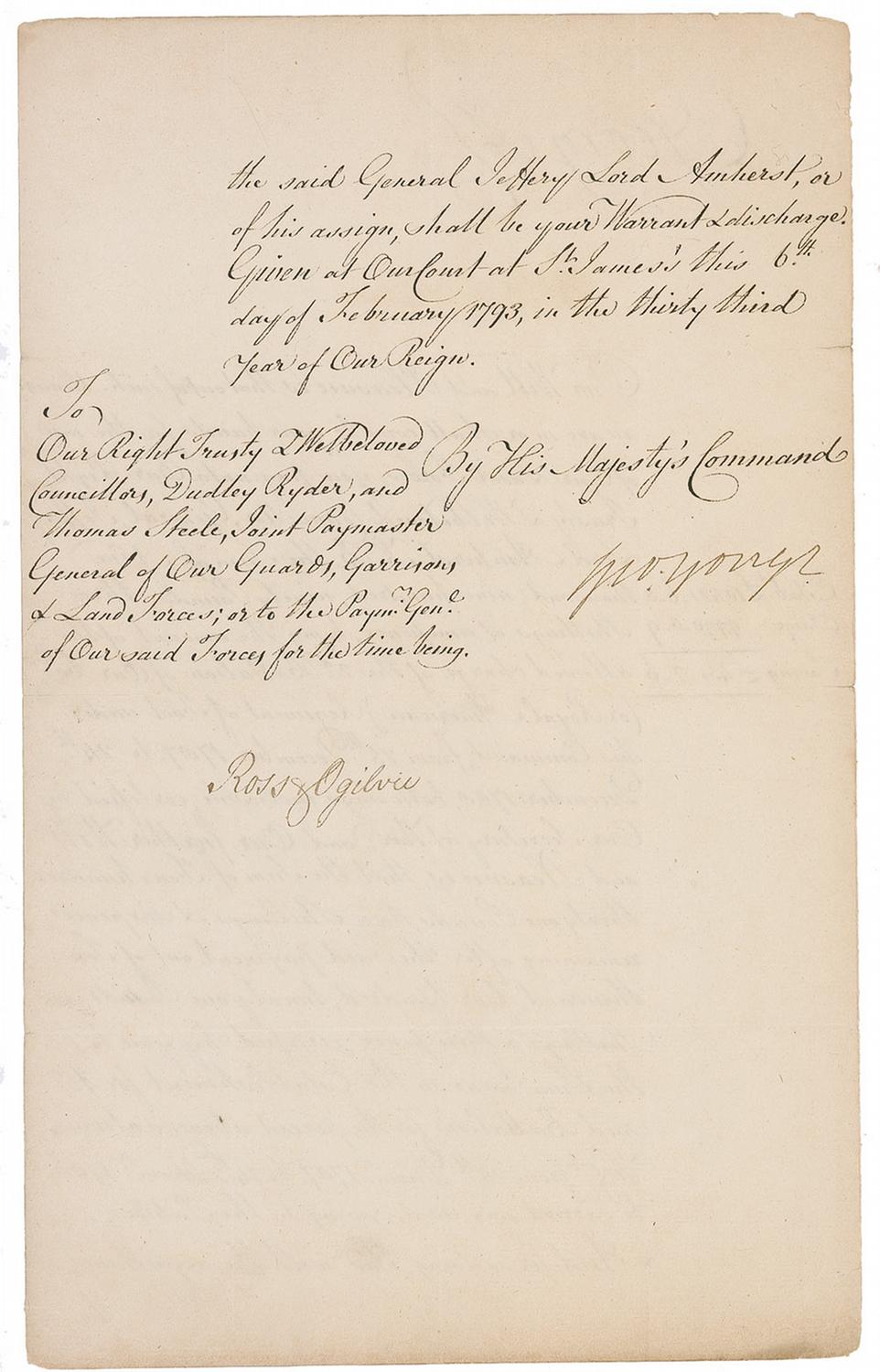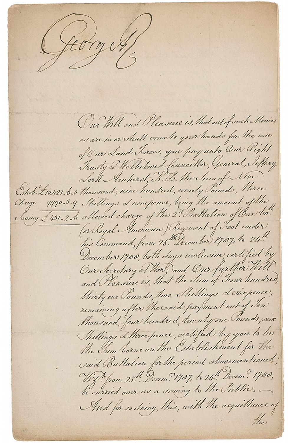 King of Great Britain and Ireland from 1760 until the union of the two countries in 1801, after which he became King of the United Kingdom of Great Britain and Ireland until his death in 1820. DS, signed “George R.,” one page both sides, 8 x 13, 1793. Official order for monies to be paid to certain battalions. In very good condition, with mild toning (heavier at the top and bottom) and a second adjoining page separated from the rest of the document.