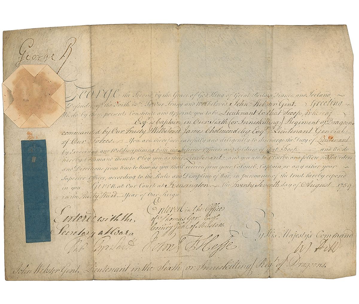 Partly-printed vellum DS, signed “George R,” one page, 13.75 x 9.75, August 27, 1759. King George appoints John Webster “to be Lieutenant to that Troop…in Our Sixth (or Inniskilling) Regiment of Dragoons commanded by Our Trusty Welbeloved James Cholmondeley.” Signed in the upper left corner by King George II and countersigned at the conclusion by William Pitt, 1st Earl of Chatham. Also signed by critic and scholar Thomas Tyrwhitt. In very good condition, with intersecting folds and scattered soiling. Originally purchased from Walter R. Benjamin Autographs and accompanied by the paper folder.